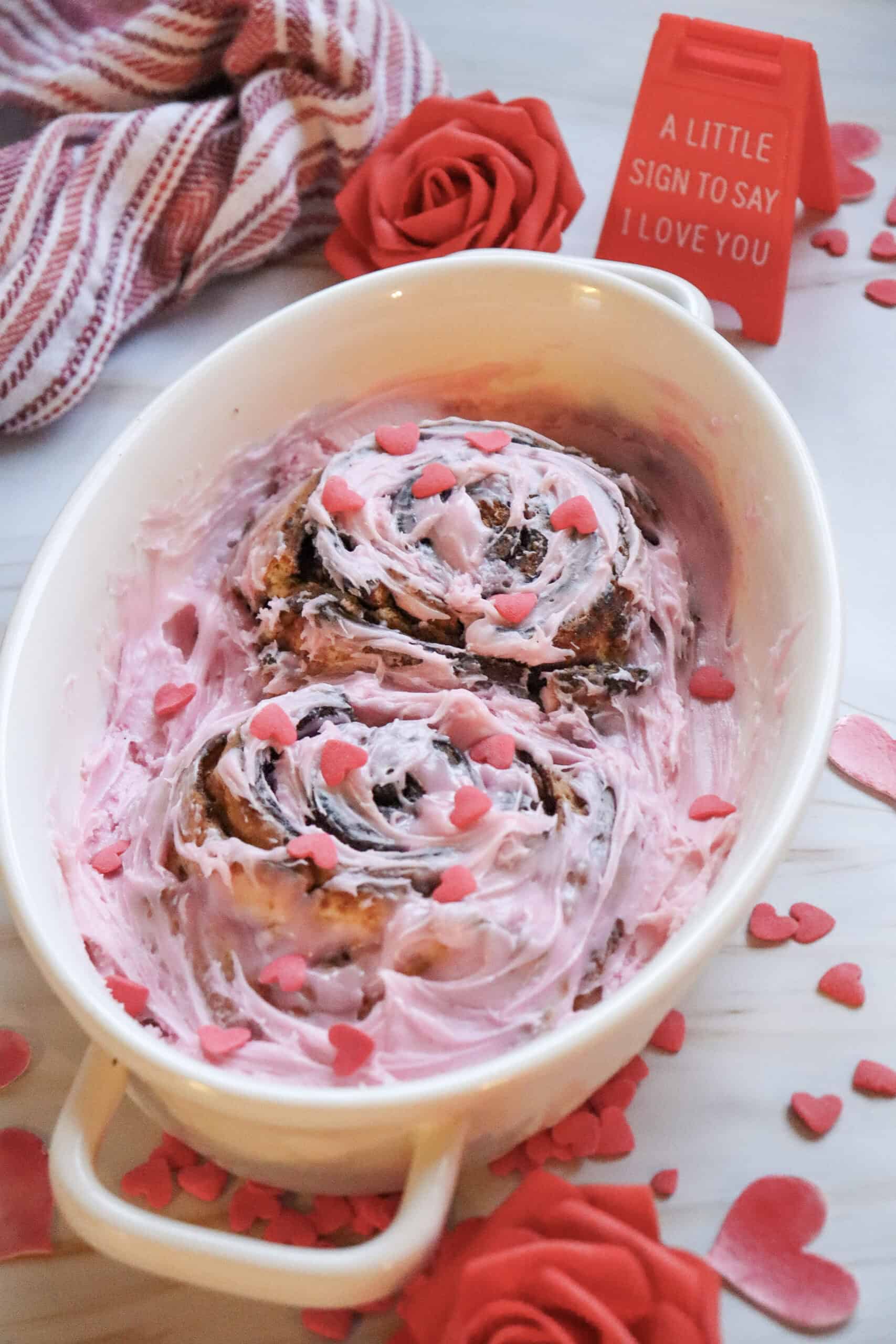Use store-bought cinnamon roll dough to keep it simple, tint your icing with a drop of red food coloring and swirl it with plain icing, or go all out and make them from scratch with a pink cream cheese frosting.