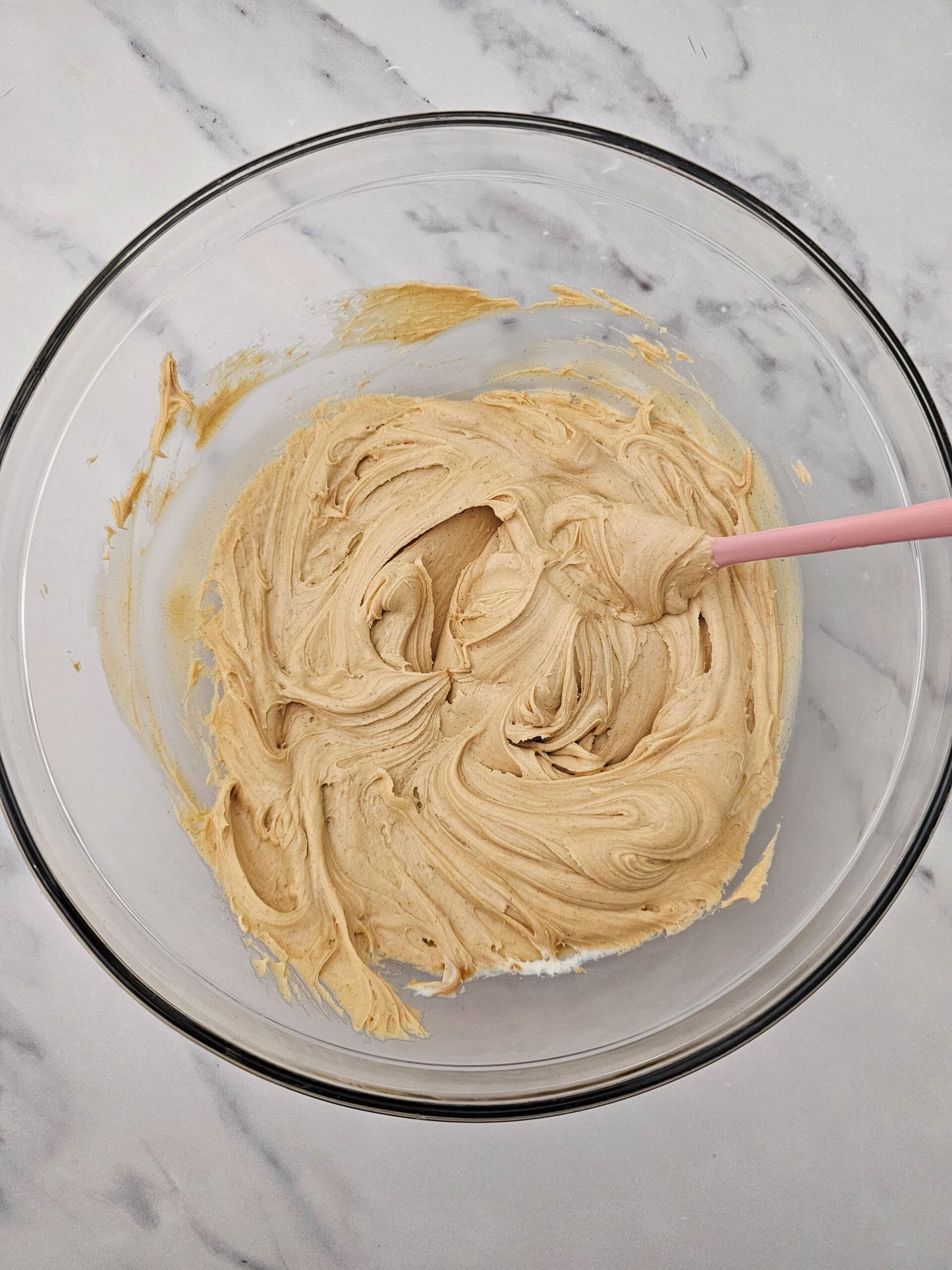 Step 1: In a large bowl, stir together the vanilla frosting, peanut butter, and softened butter until the mixture is smooth and fully combined. You want it creamy with no streaks.