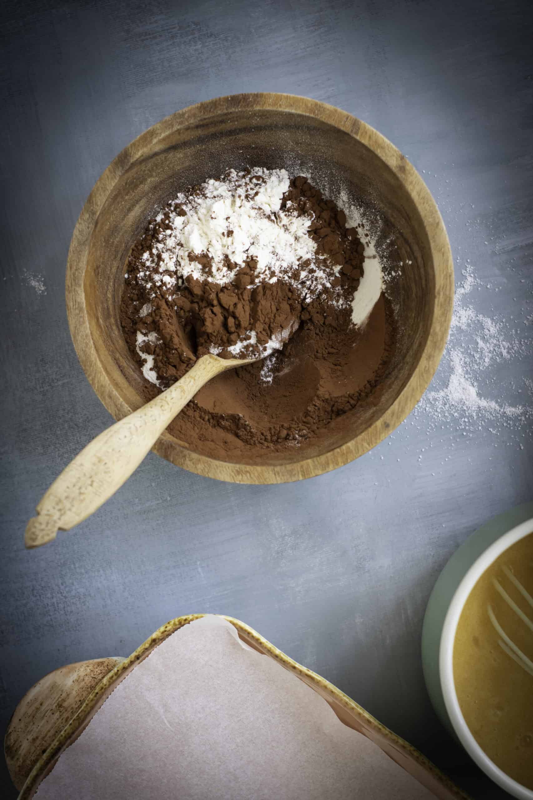 Step 3: Whisk flour, cocoa powder, baking powder, and salt together. Add to the wet mixture and stir until fully combined.