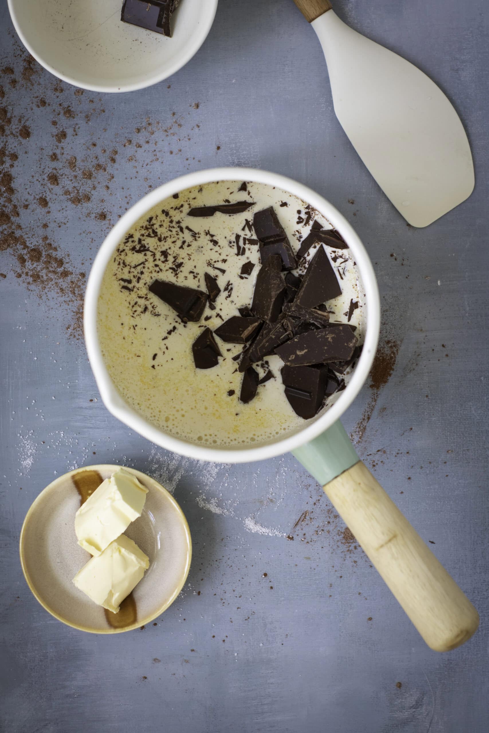 Step 5: Heat heavy cream until just simmering, then pour over chopped chocolate. Let sit for 2 minutes, stir until smooth, and mix in butter.