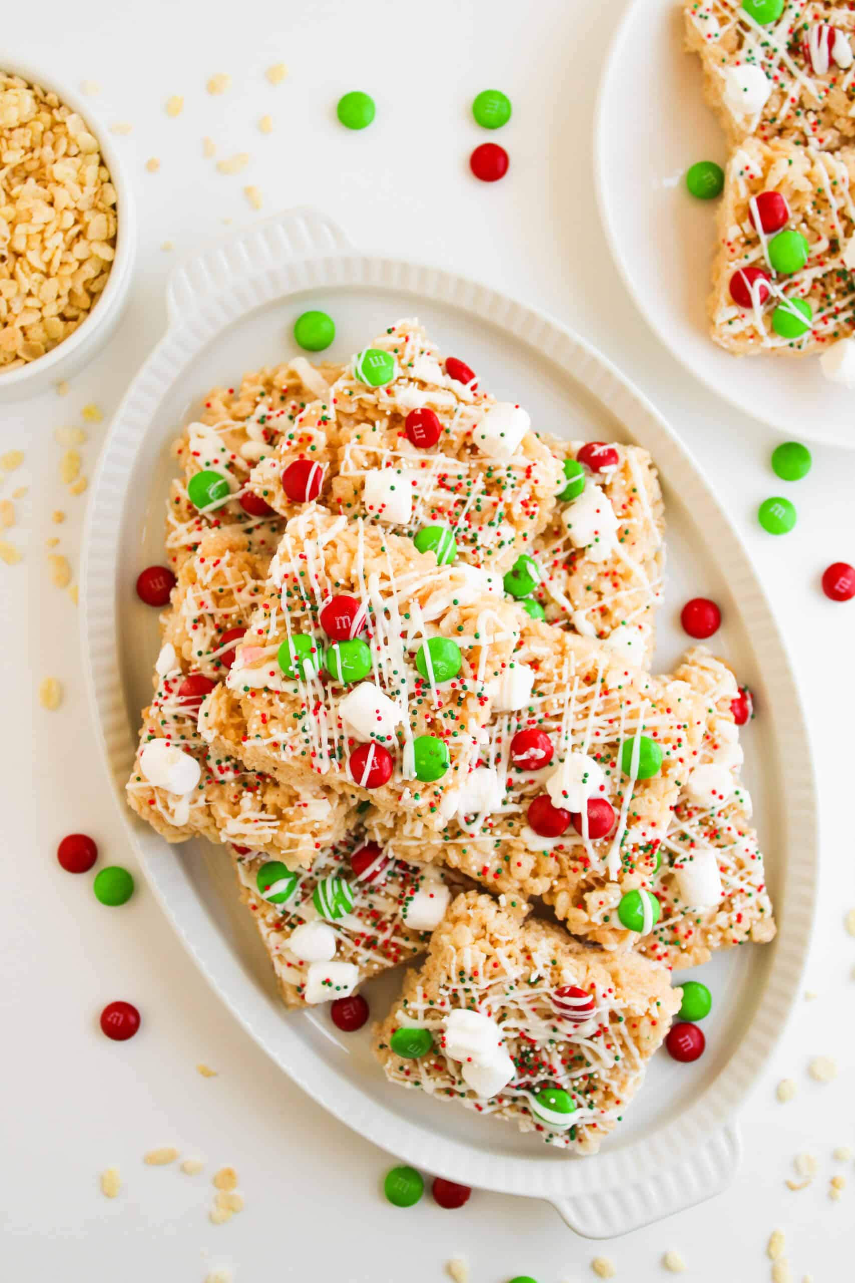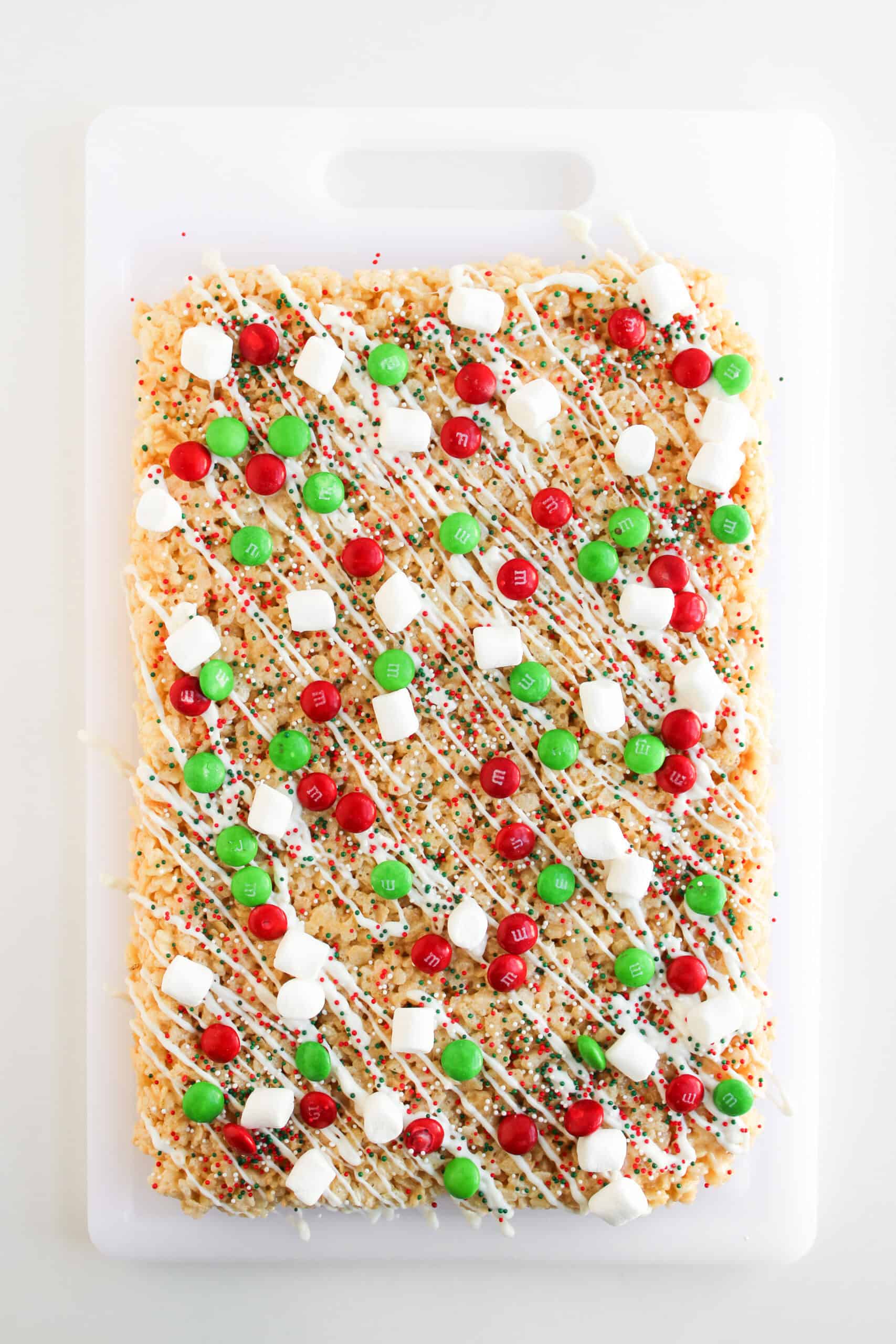 These Christmas Rice Krispies are soft, buttery, and perfectly festive with white chocolate drizzle, colorful sprinkles, and M&Ms. A fun no-bake holiday dessert that's easy to make, totally cute, and always a crowd favorite!