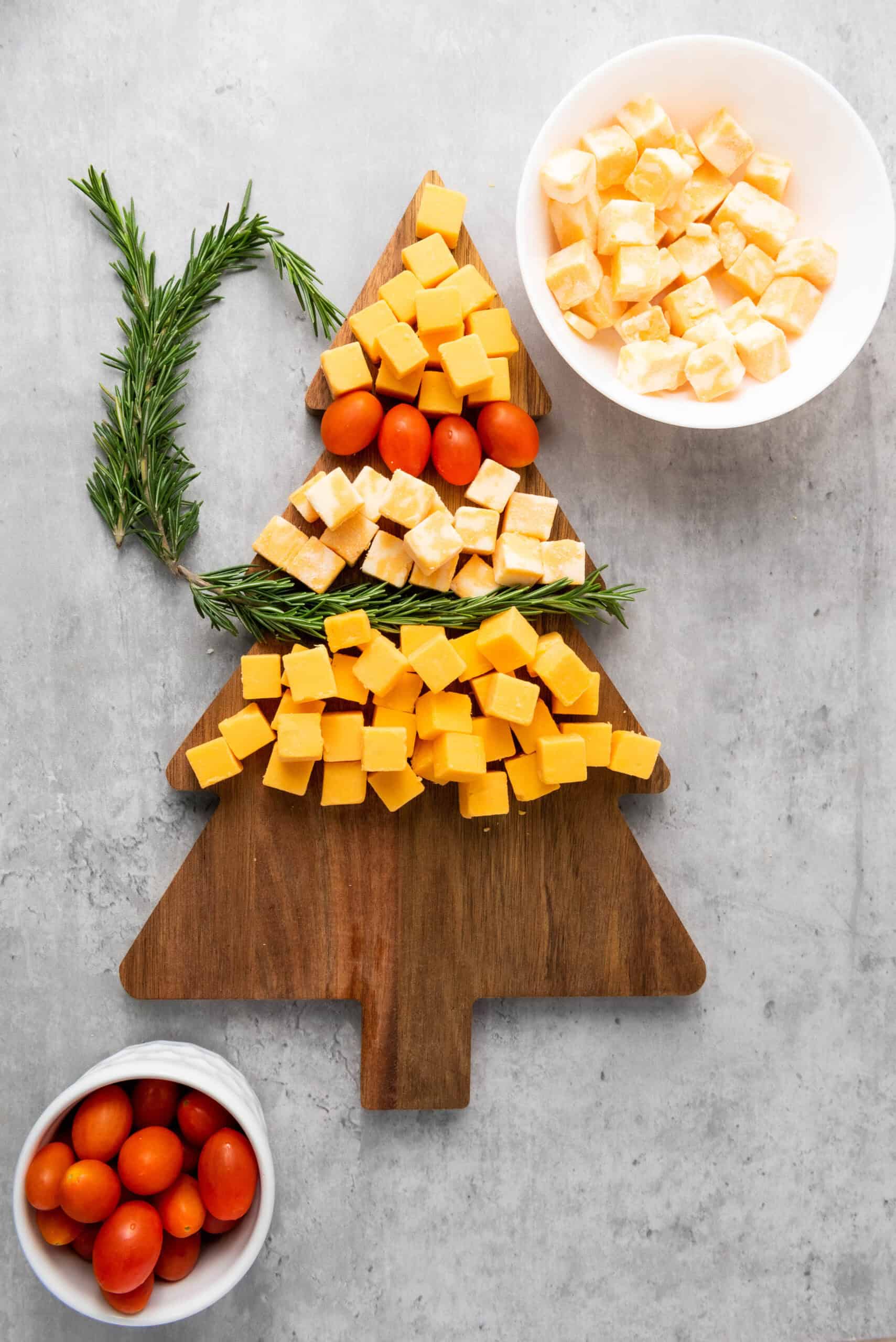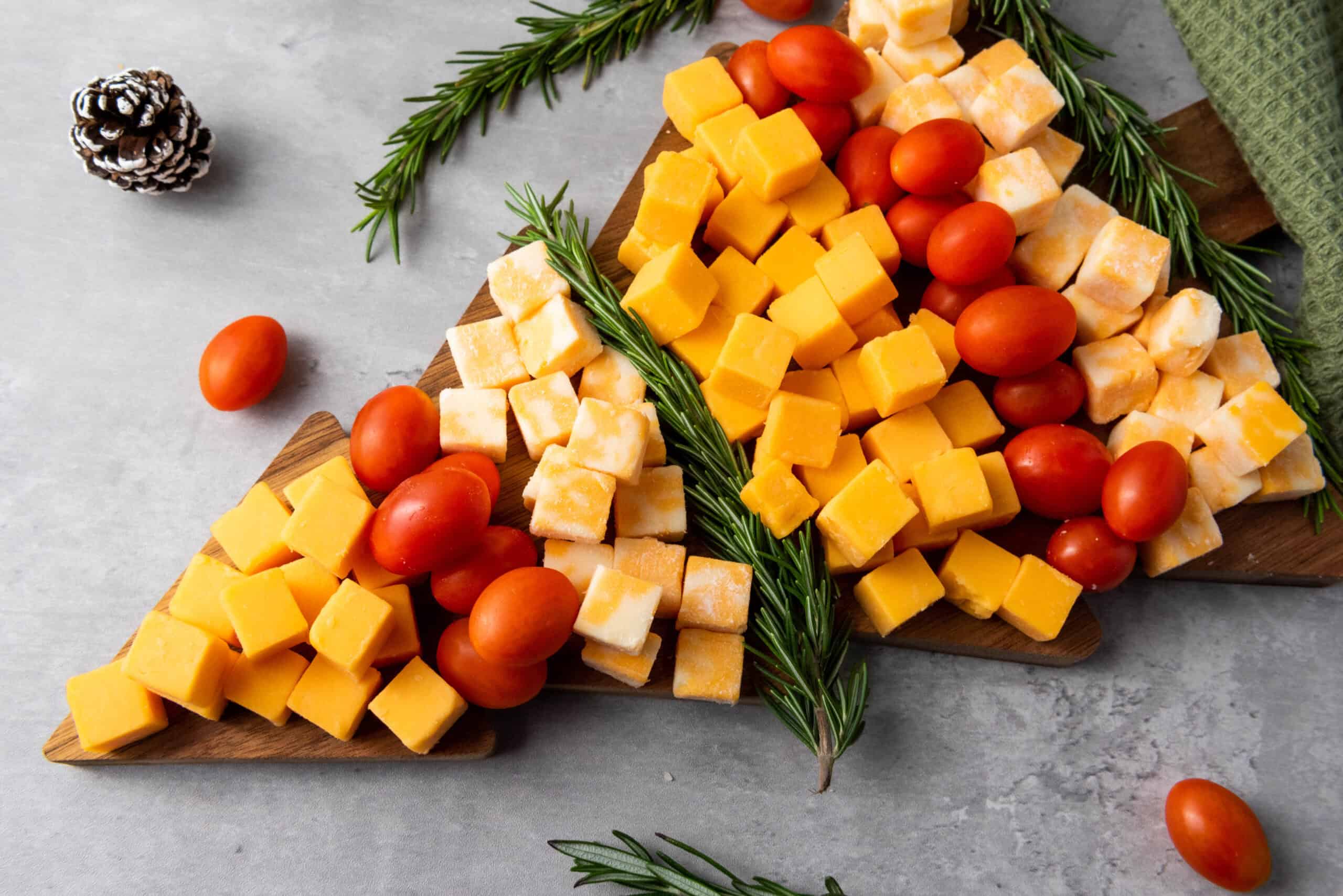 This Christmas Tree Cheese Platter is a festive, easy holiday appetizer made with cheese cubes, cherry tomatoes, and rosemary. Perfect for Christmas parties or cozy nights in.
