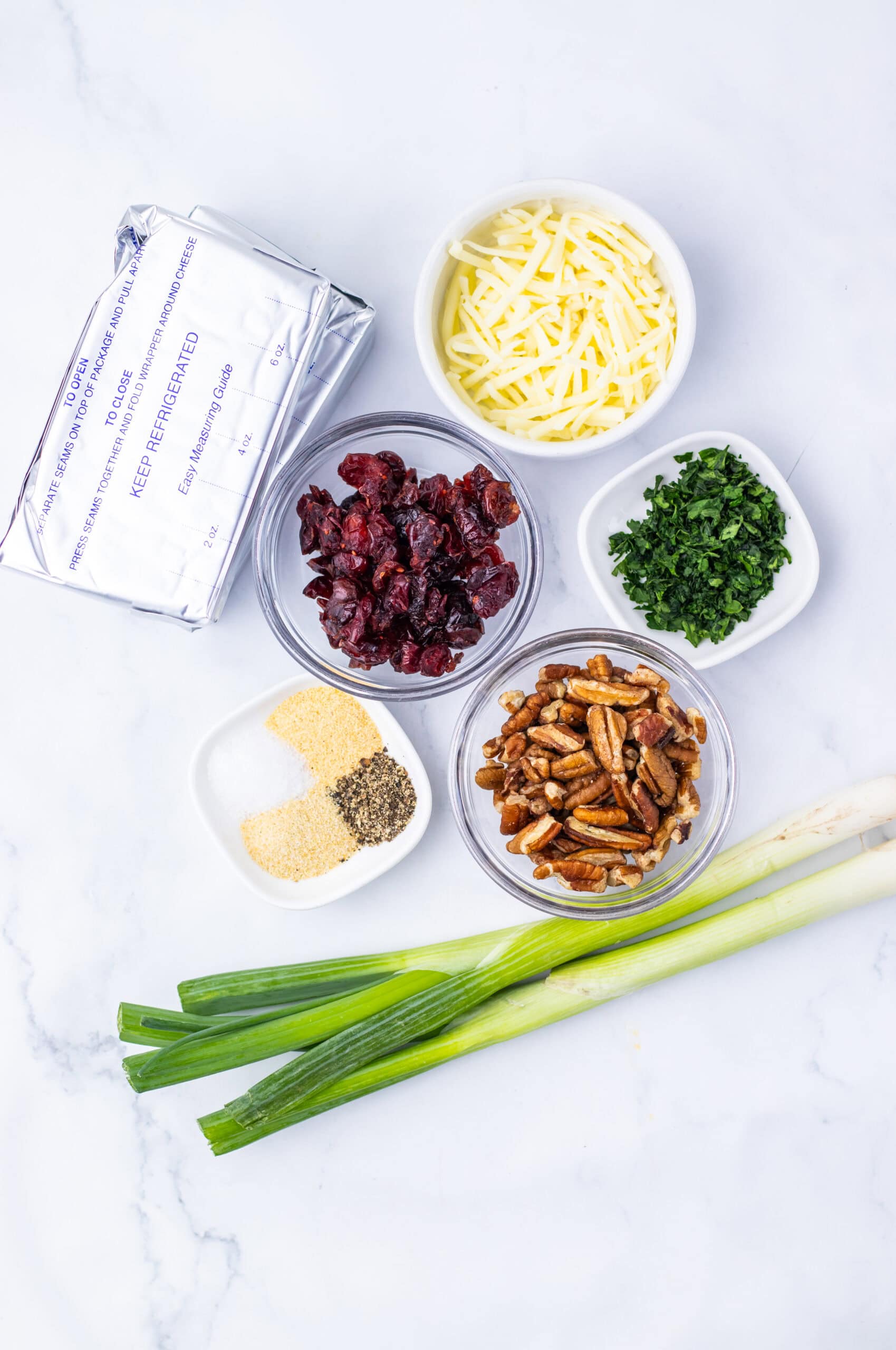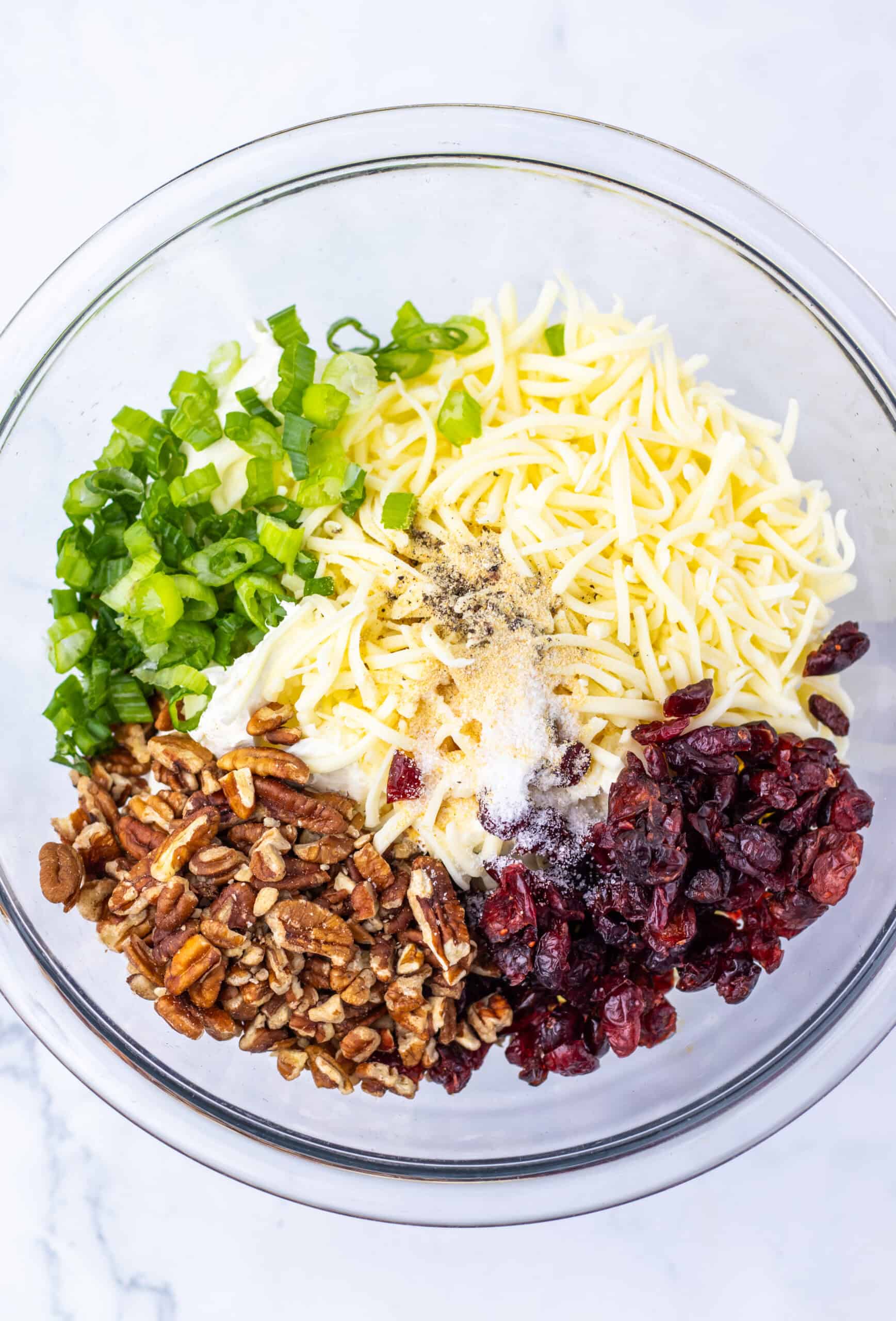 Step 1: Line a large tray with parchment paper. In a big mixing bowl, combine softened cream cheese, half the pecans, the shredded white cheddar, green onions, half the cranberries, and all the seasonings. Mix on low speed until everything blends smoothly.