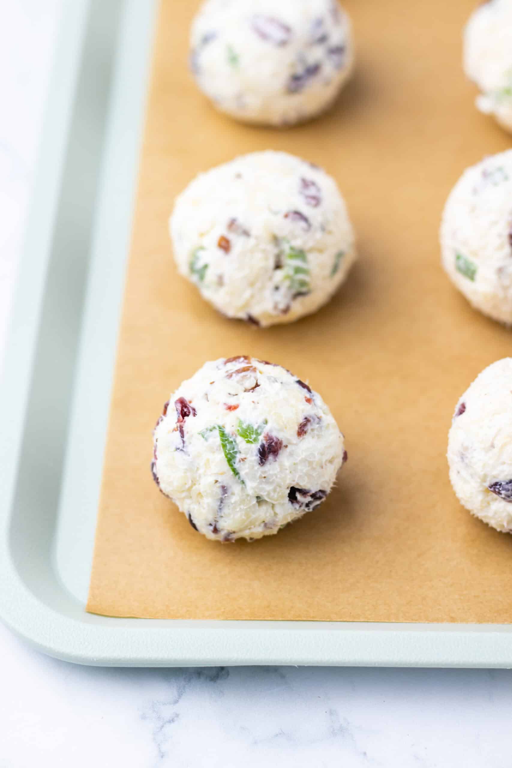 Step 3: Once all the cheese balls are rolled, cover the tray with plastic wrap and refrigerate for one hour so they firm up.