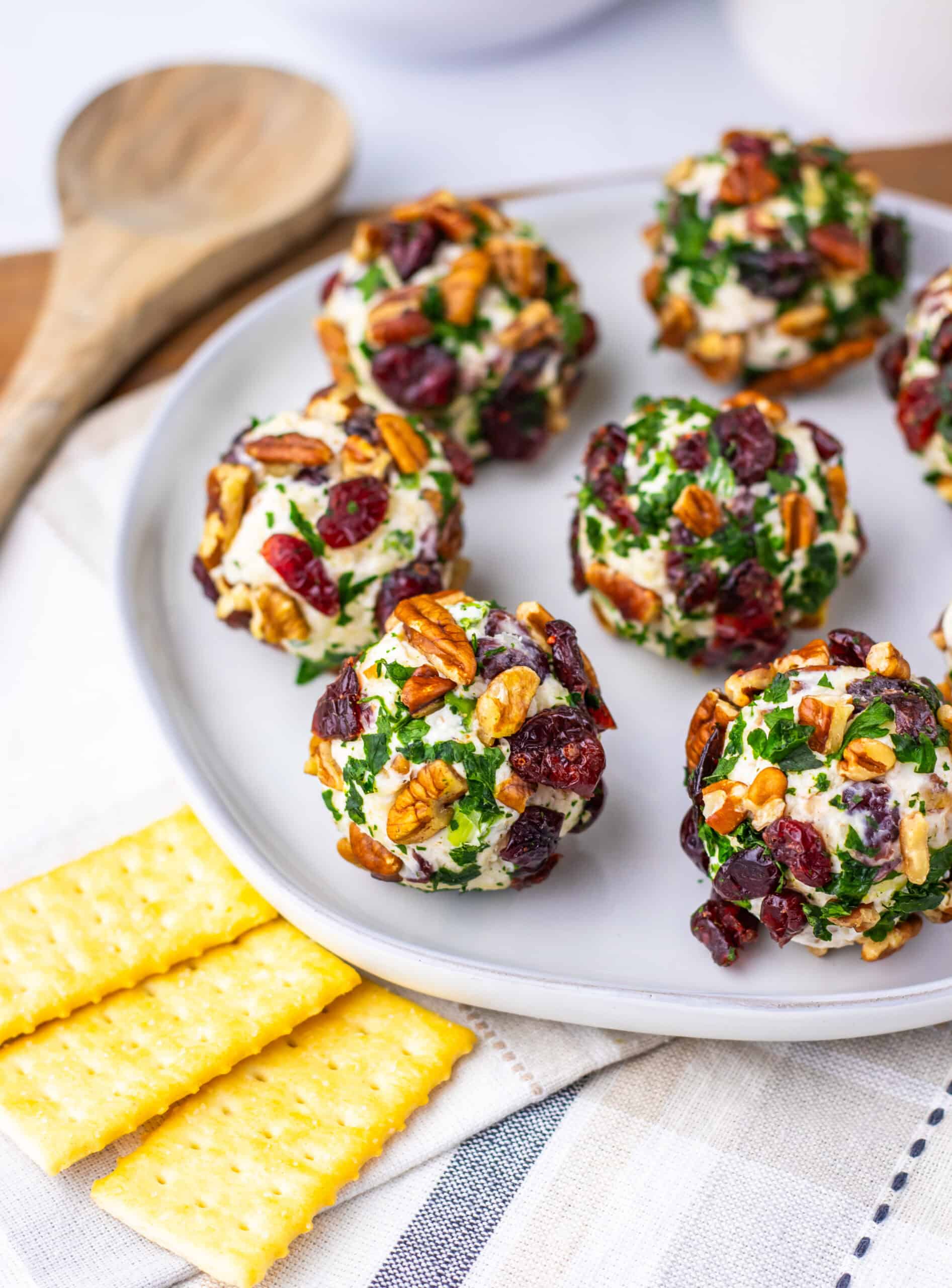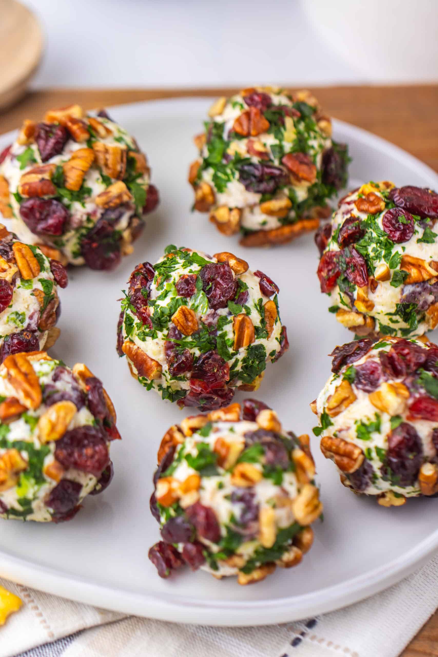 Add the remaining pecans, cranberries, and parsley to a plate. Roll each cheese ball in the mixture and gently press toppings to stick.