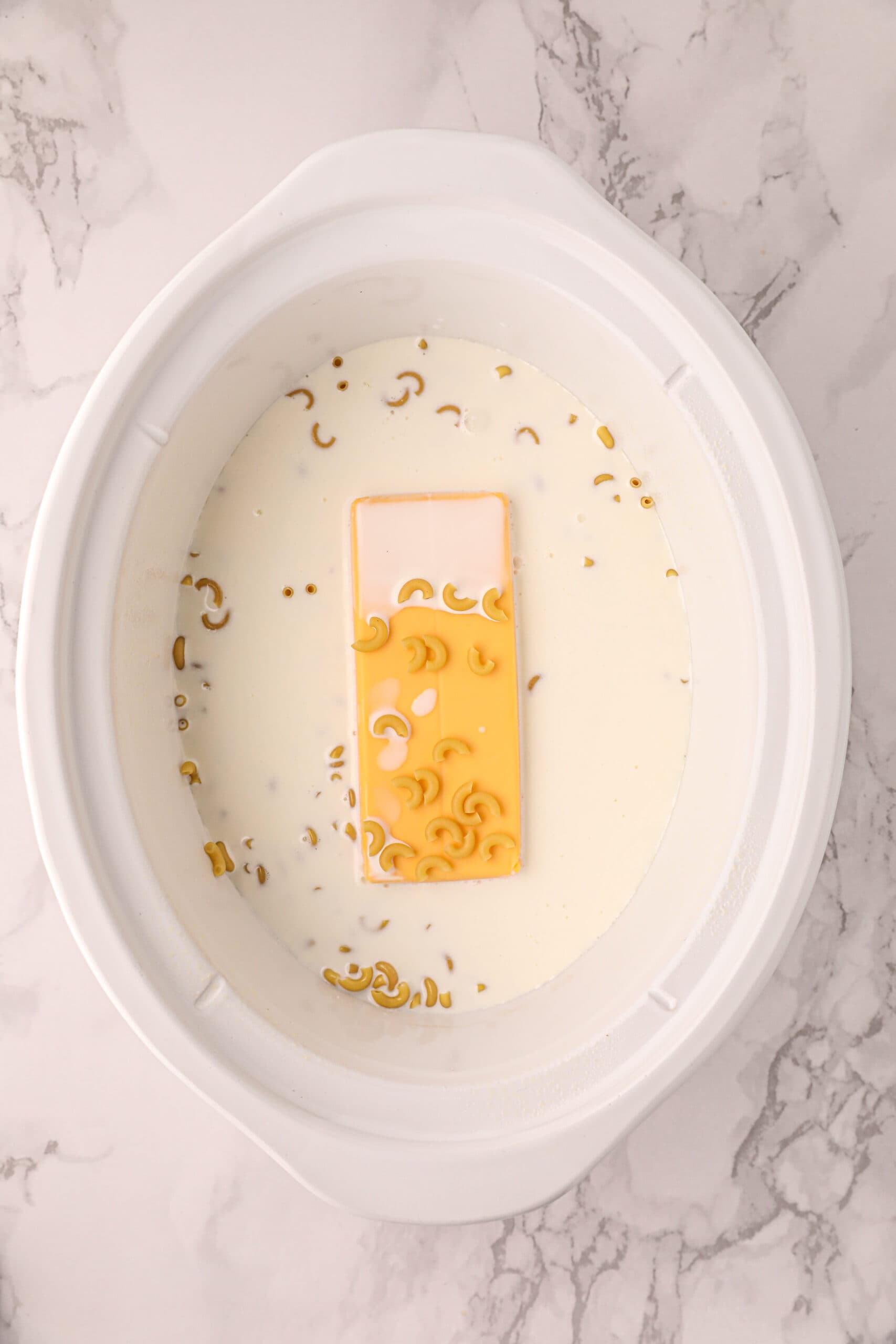Set the Velveeta block right in the center of the slow cooker, then scatter the dry elbow macaroni all around it.