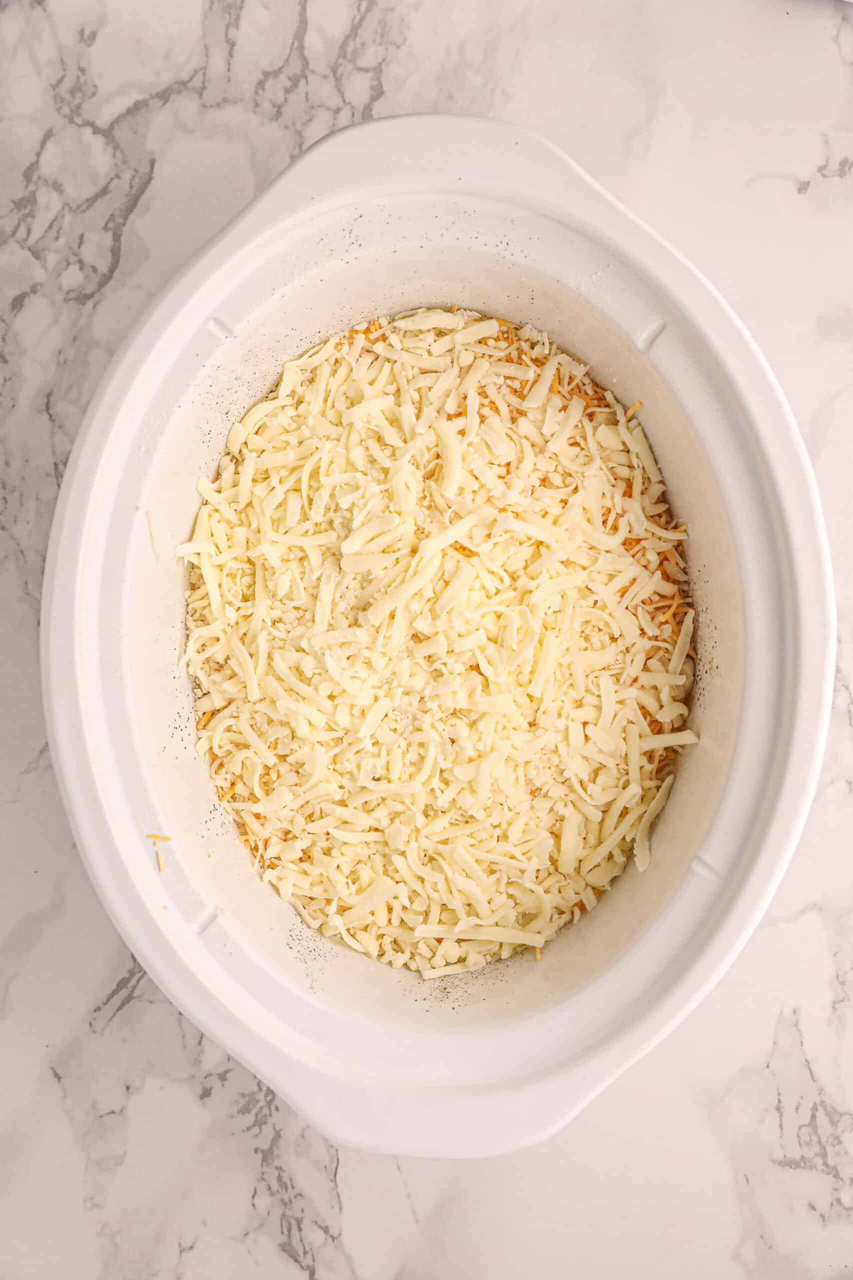 Top the mixture with the shredded mozzarella and cheddar cheeses.