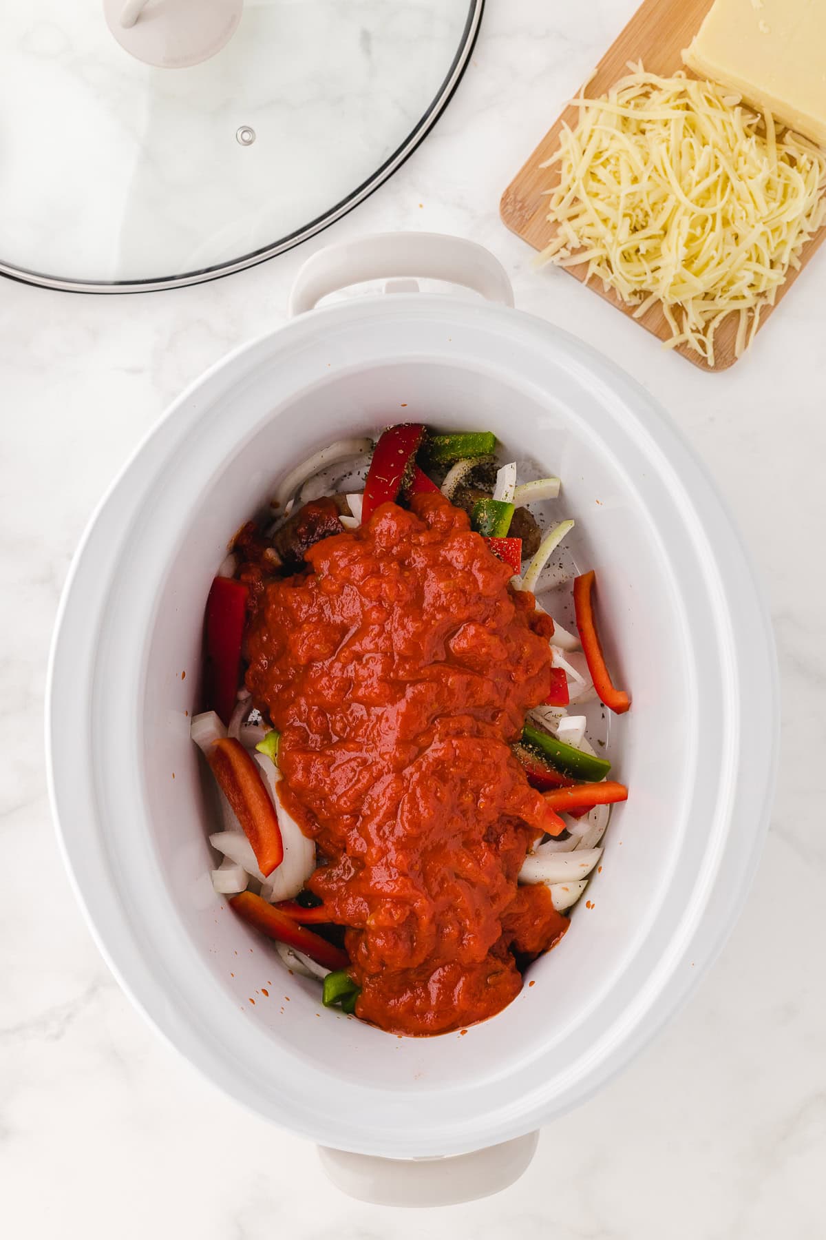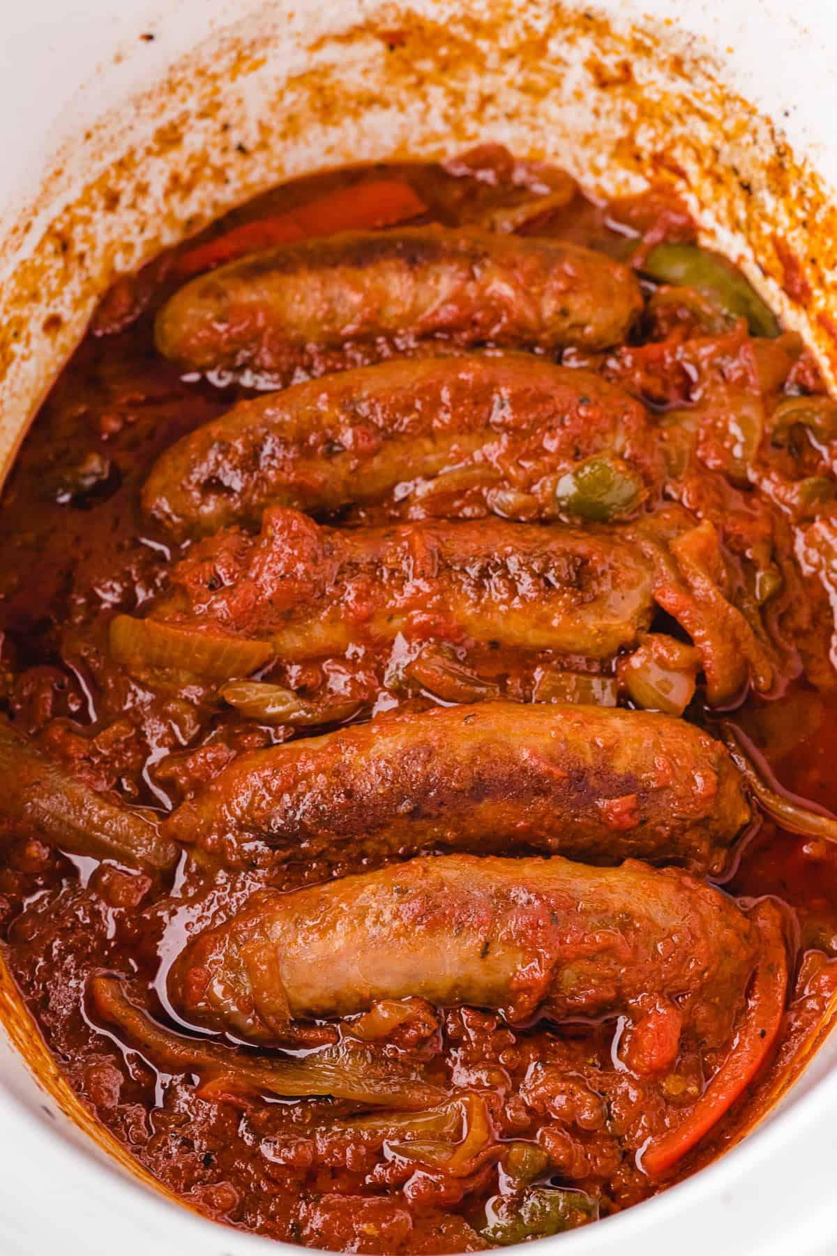 Step 3: Pour the marinara sauce evenly over the vegetables. Cover and cook on high for 3 to 4 hours or on low for 6 to 7 hours until the sausages are fully cooked and the peppers are tender.