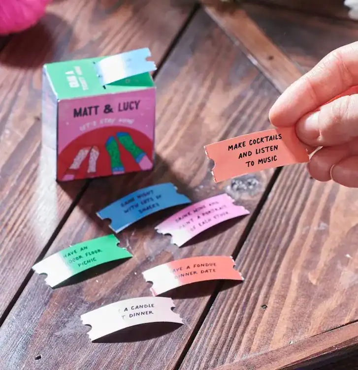 This DIY date-night ticket box is a fun and romantic way to keep your relationship feeling playful all year long. The colorful prompts make it feel aesthetic and thoughtful, and it's perfect for boyfriends who love quality time over pricey gifts. Fill it with personalized date ideas-like cocktails at home, movie nights, or surprise adventures-so he can pull a new activity anytime you want to make the night special.