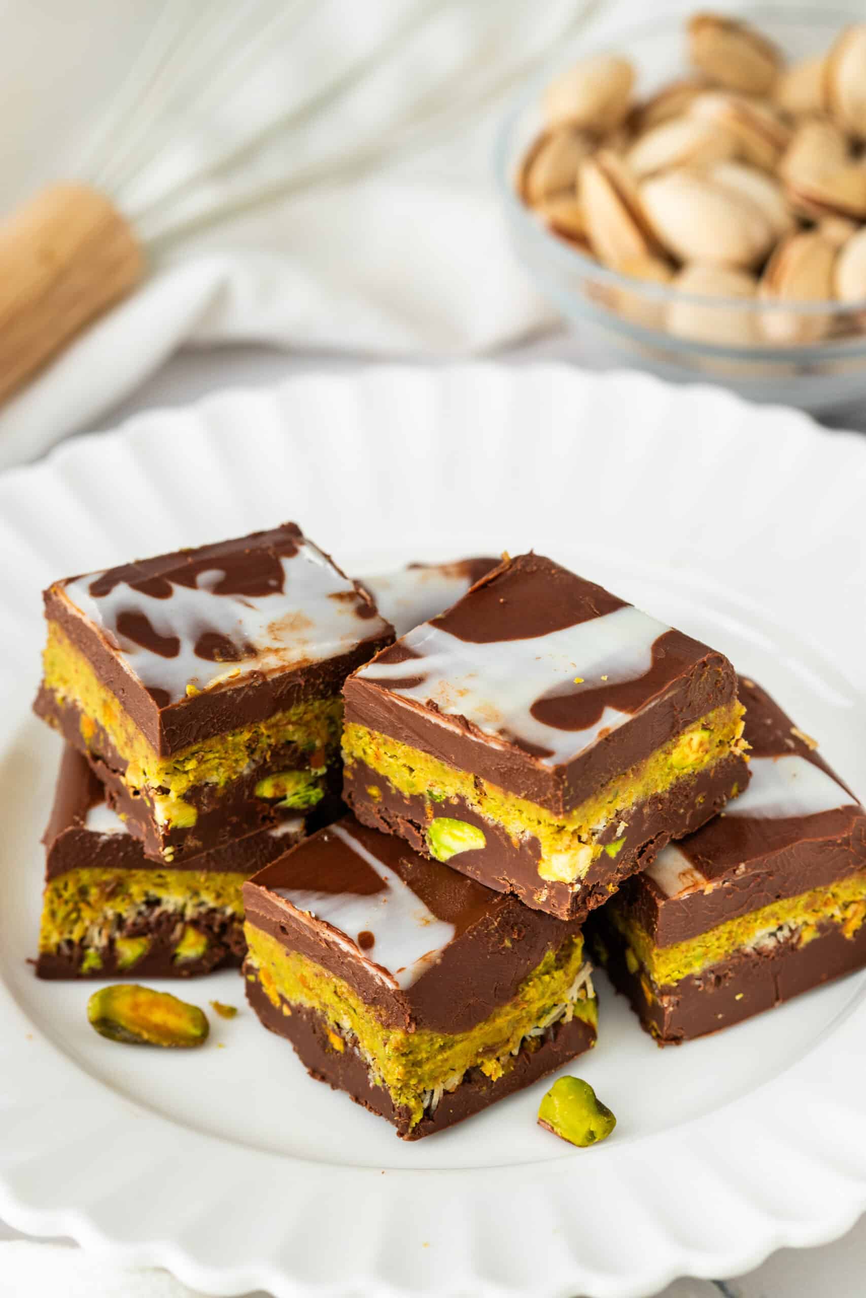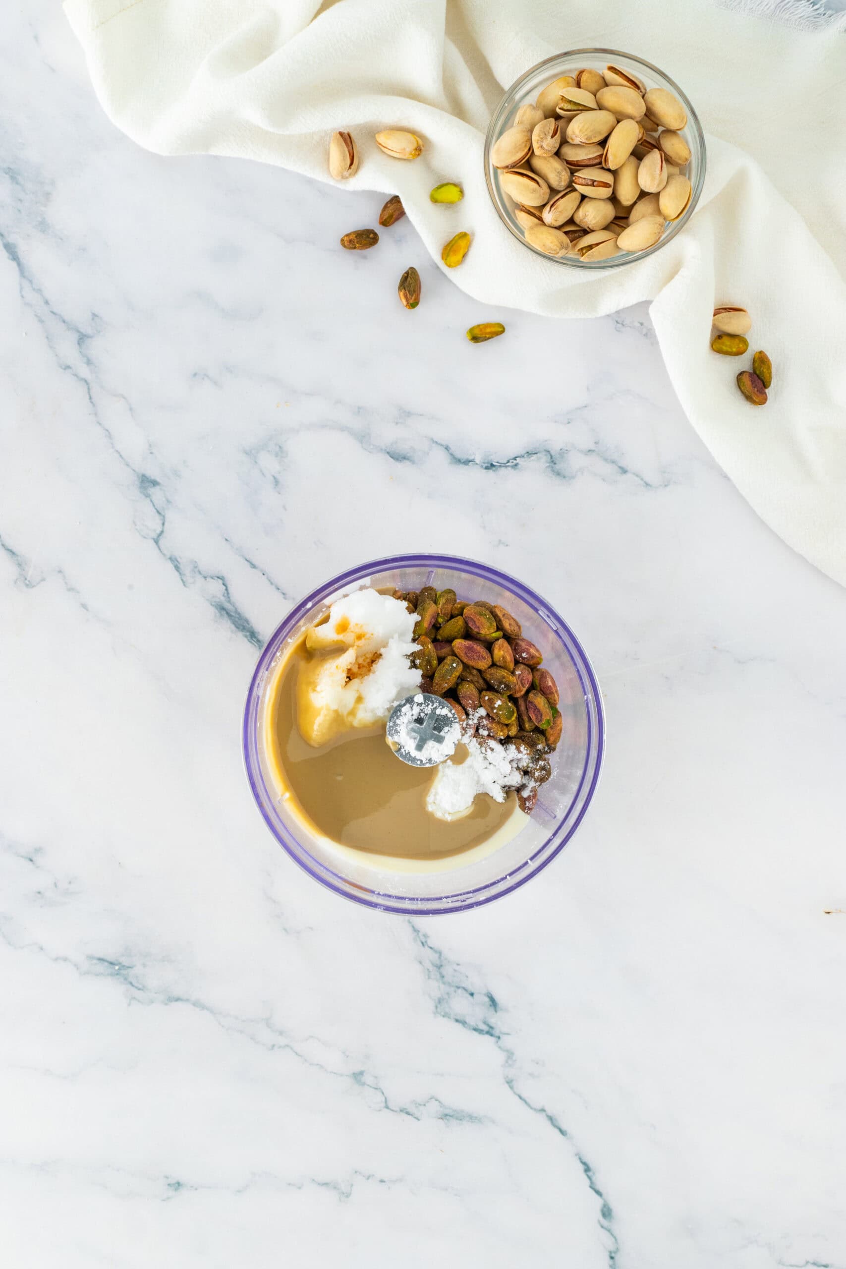 Step 5: Blend together the pistachios, powdered sugar, tahini, vanilla, melted vanilla chips, and a little oil until creamy. Spread it over the chilled chocolate layer.