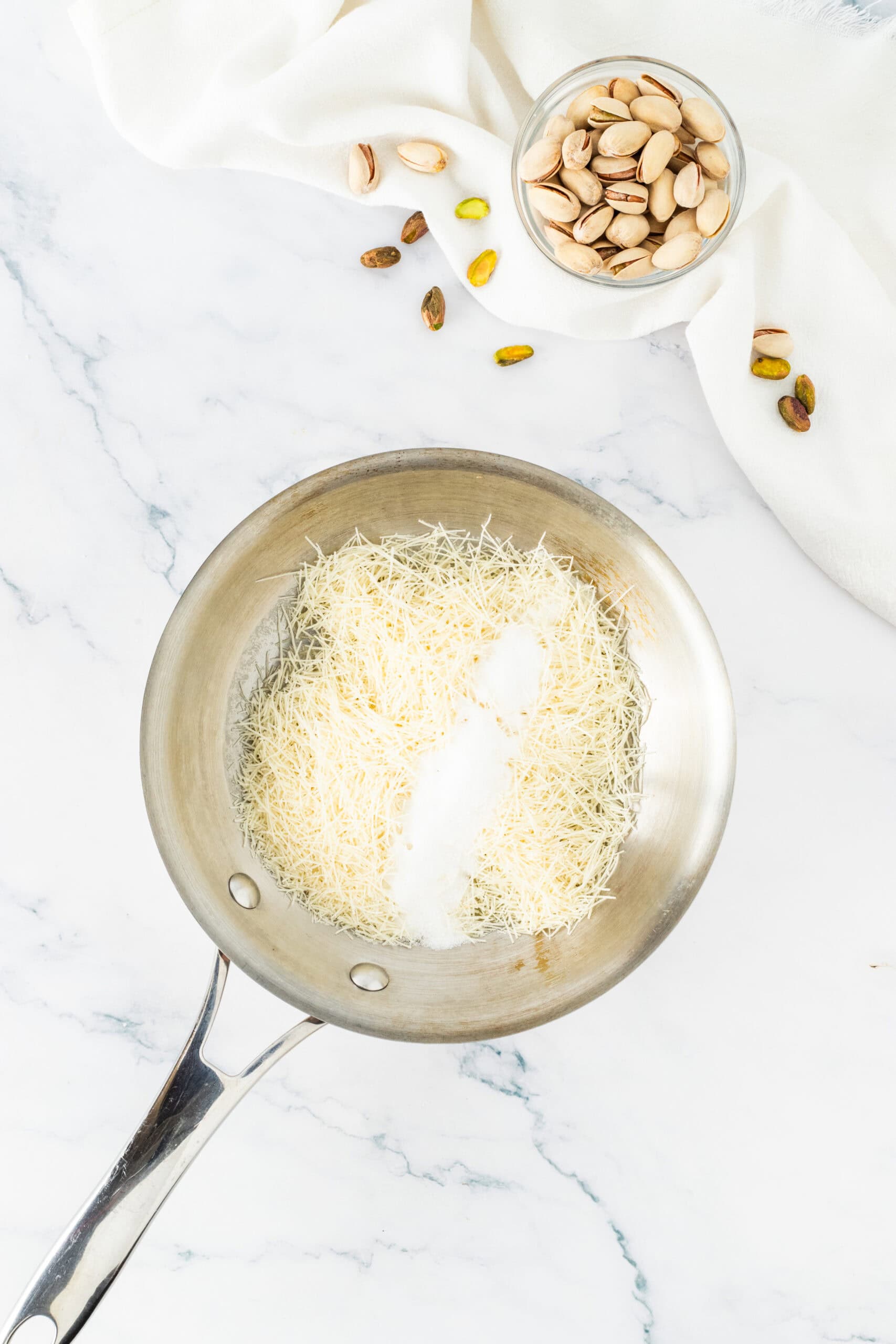 Step 2: In a skillet, toast the kataifi with butter, sugar, and salt until lightly golden. Let it cool completely so it stays crisp inside the bar.