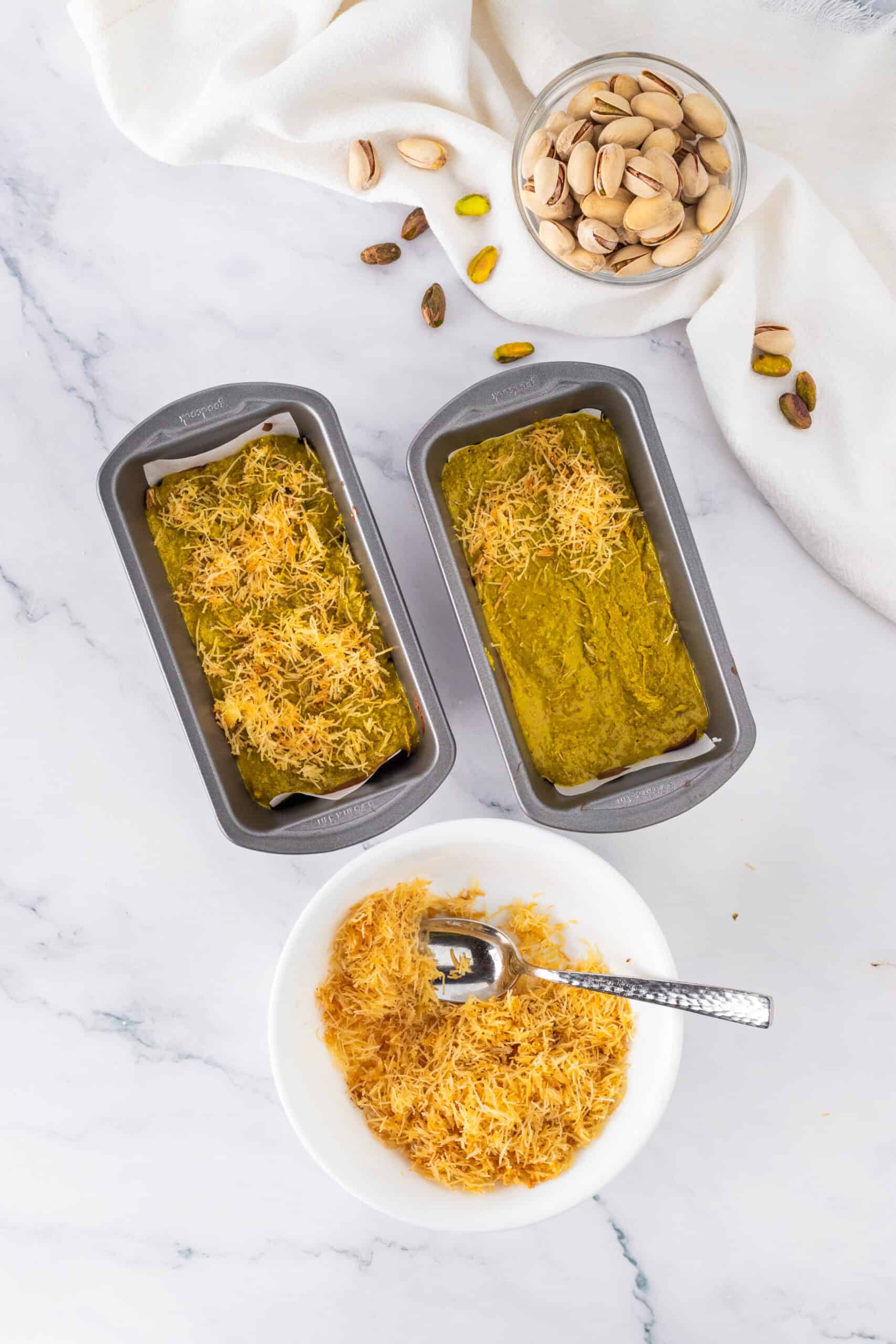Step 6: Sprinkle cooled kataifi and chopped pistachios on top of the pistachio cream, pressing gently so it sticks, then freeze again to chill.