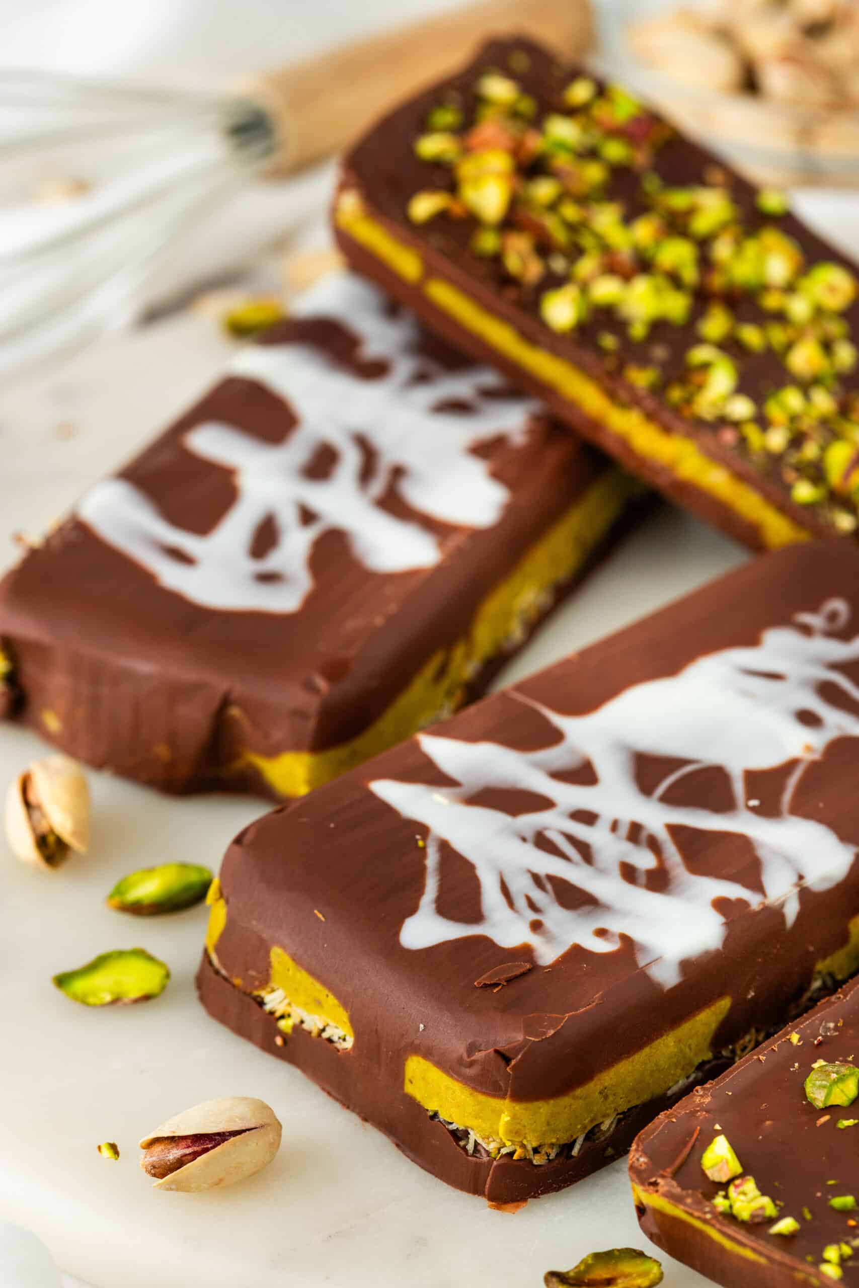 I've been obsessed with layered no bake desserts lately because they feel fancy but are secretly so easy. The pistachio cream comes together in minutes, the chocolate melts smooth every time, and the whole bar slices into perfect candy-shop style pieces. It's the kind of recipe that feels luxurious but still fits my lazy girl mood.