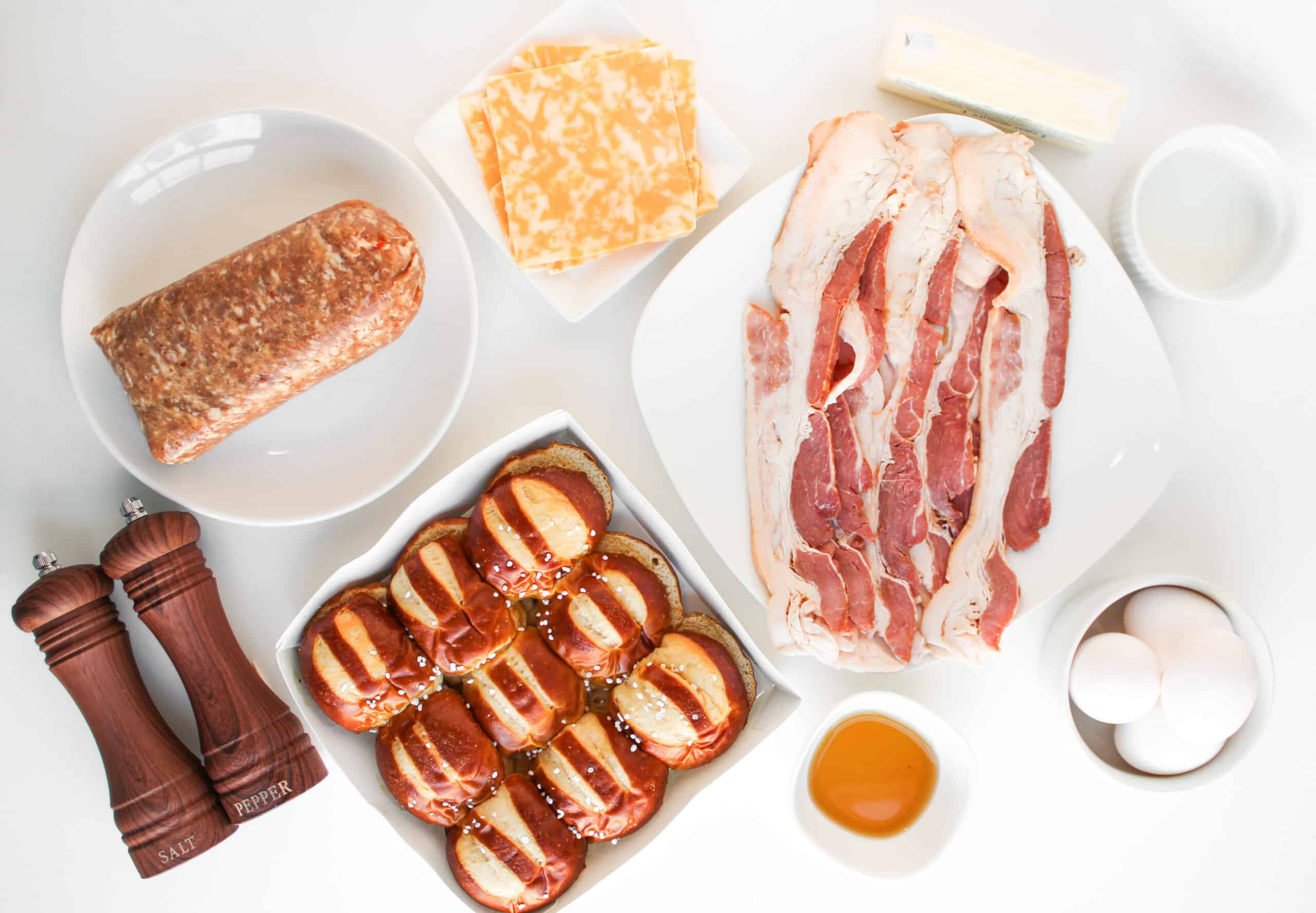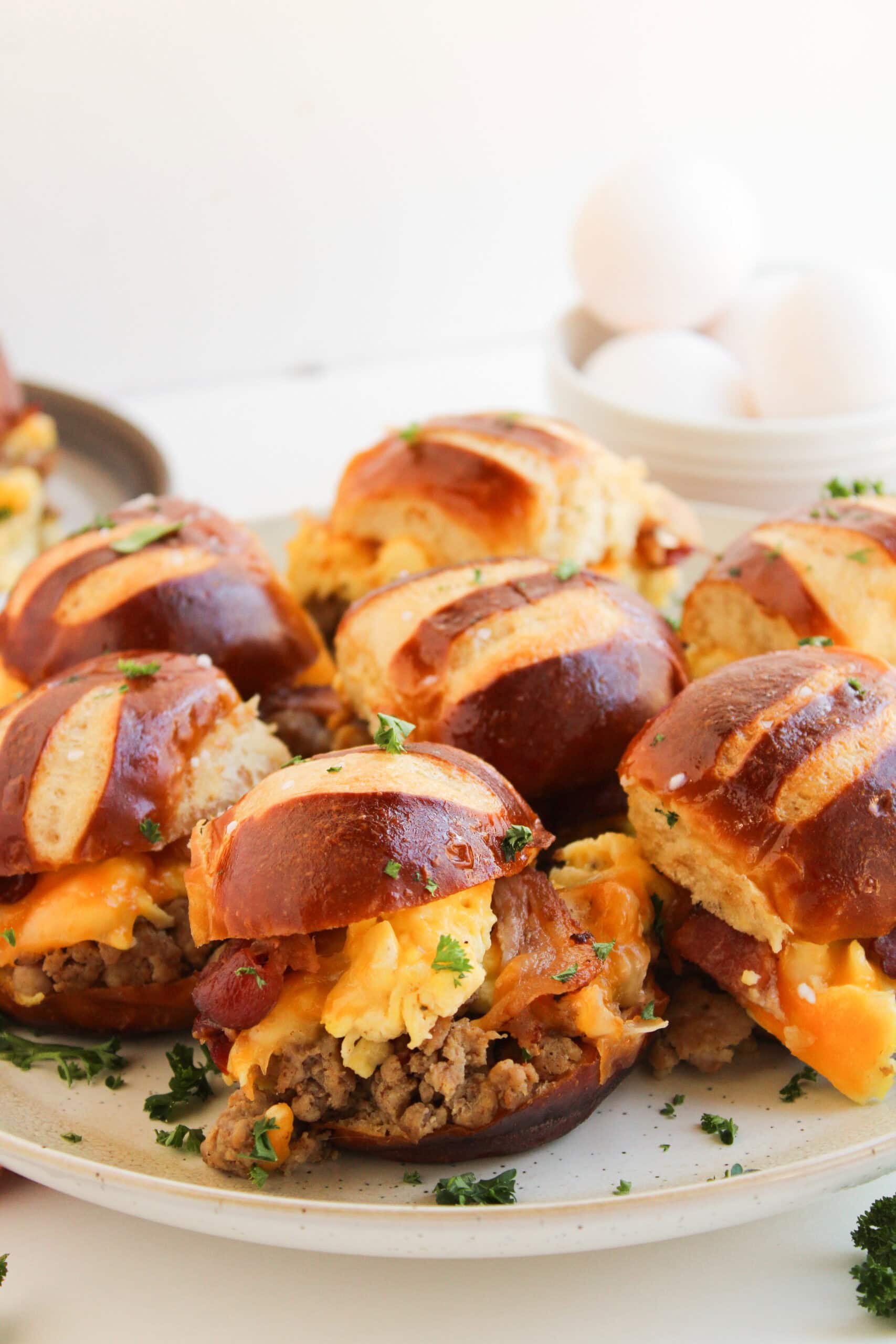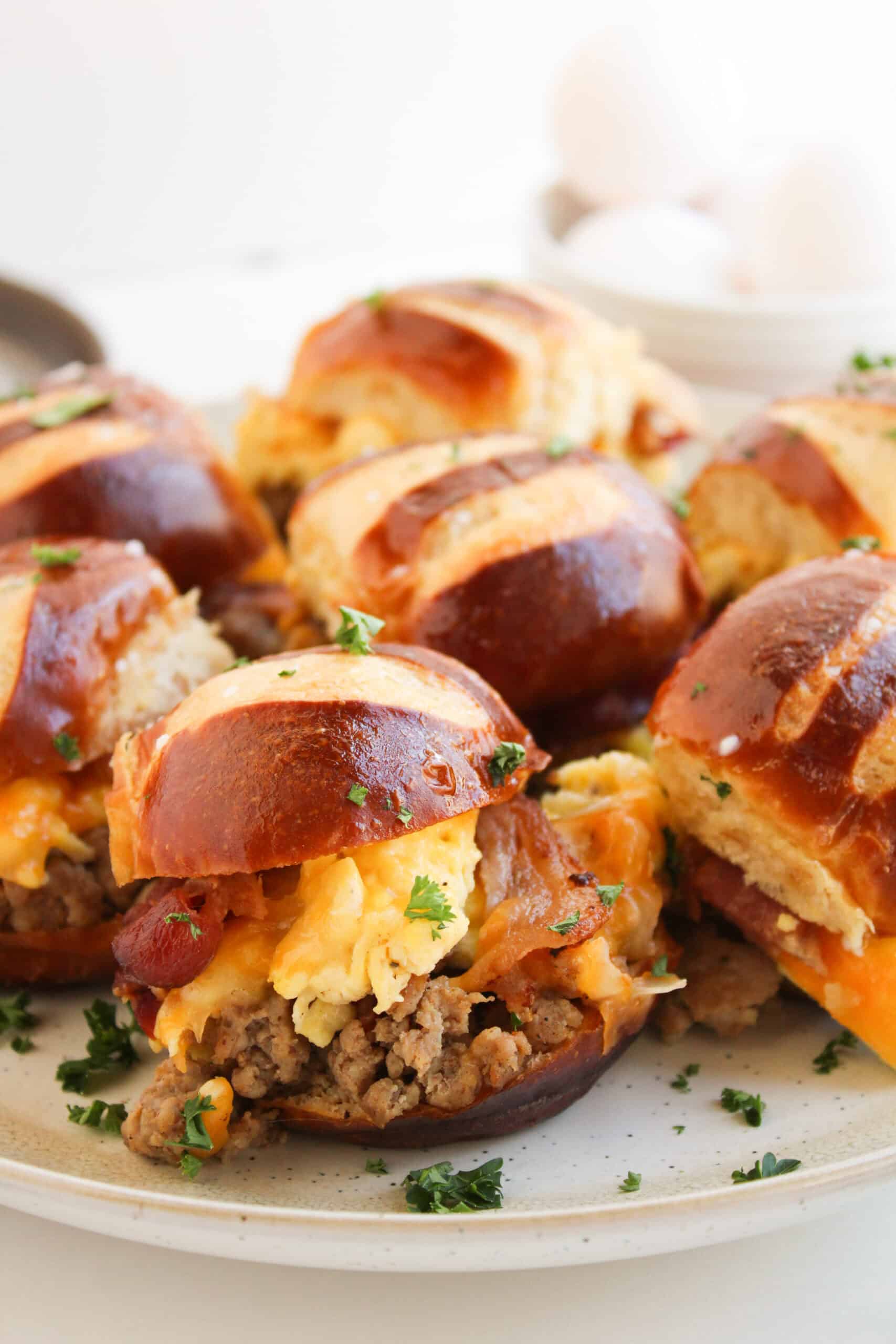 Arrange the bottom halves of the pretzel buns in the prepared dish. Layer with sausage, scrambled eggs, cheese slices, and bacon. Place the top buns on.
