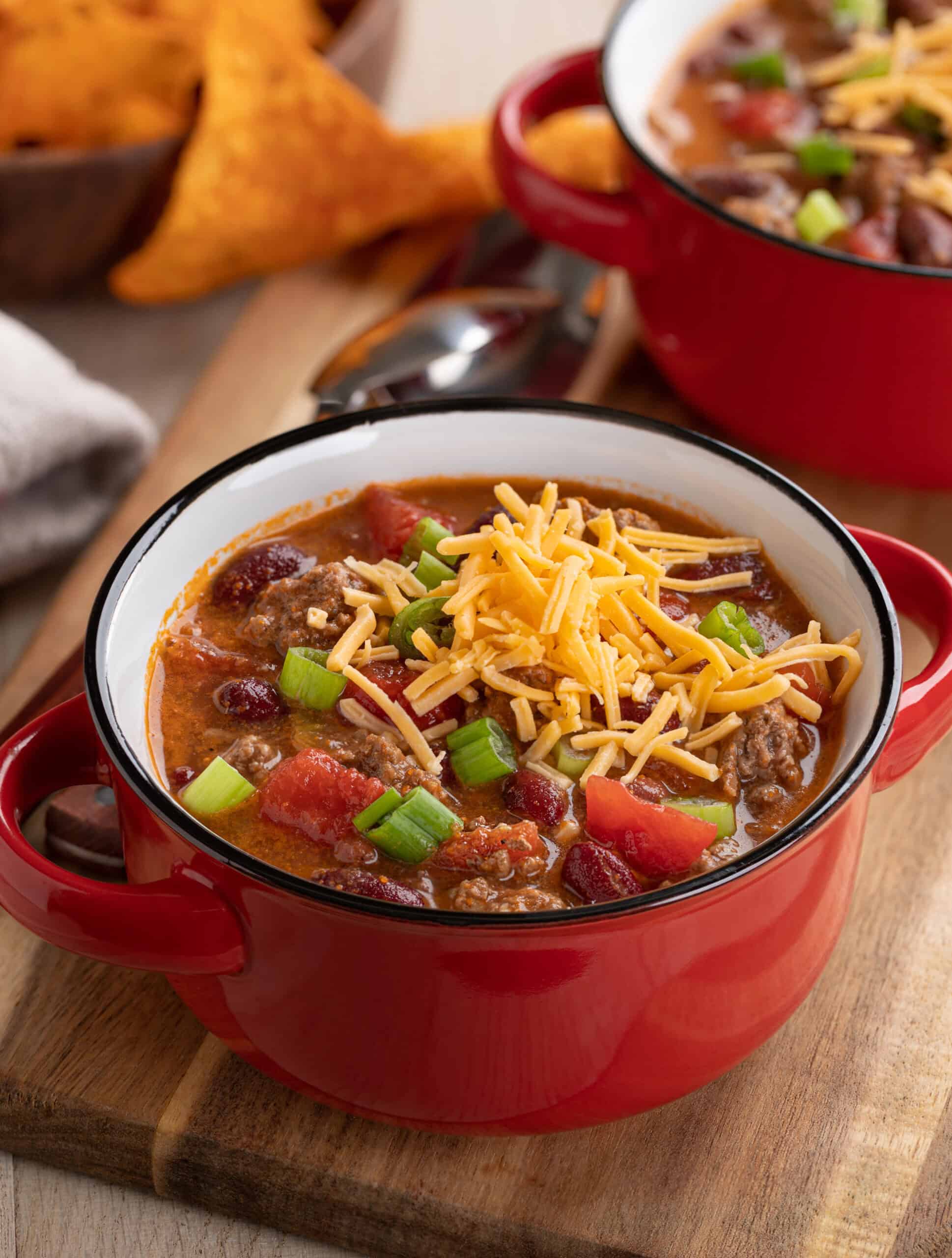 Our classic yet easy Crock Pot ground beef chili simmers with beans, tomatoes, and spices until thick and hearty. Top with cheese, sour cream, or green onions or parsley for the ultimate bowl of comfort.