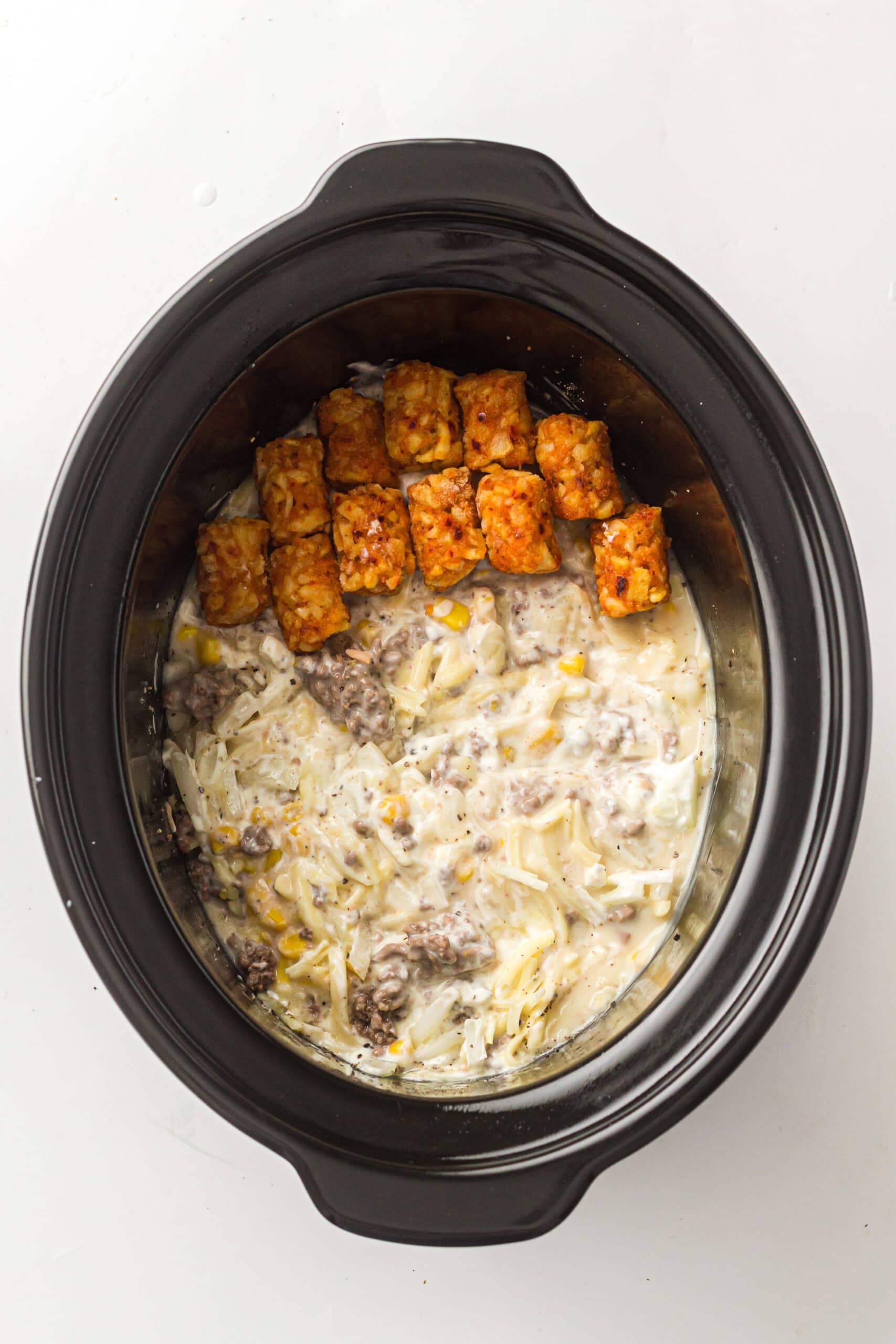 Step 2: Spread the frozen tater tots in an even layer on top. Make sure they stay on the surface so they cook and soften instead of sinking into the mixture.