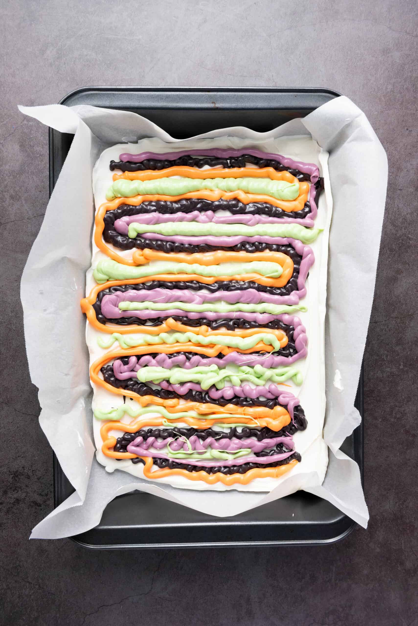Step 5: Drop spoonfuls of the colored melts over the white base. Swirl gently with a toothpick or skewer for that marbled, Halloween vibe.