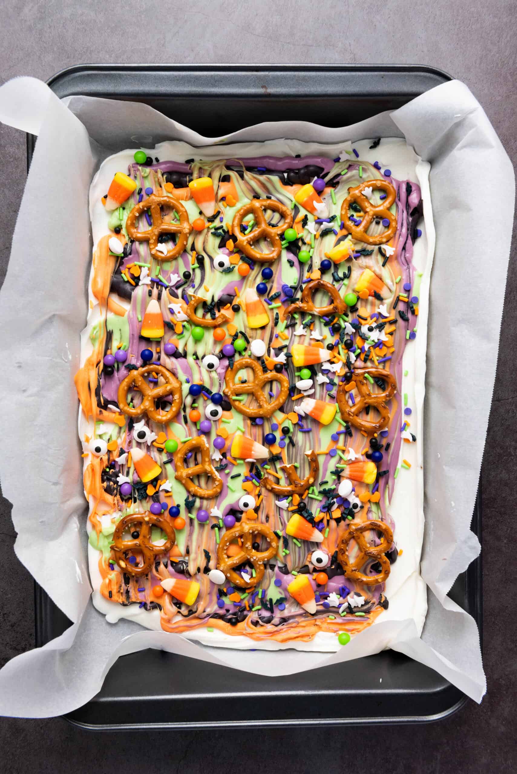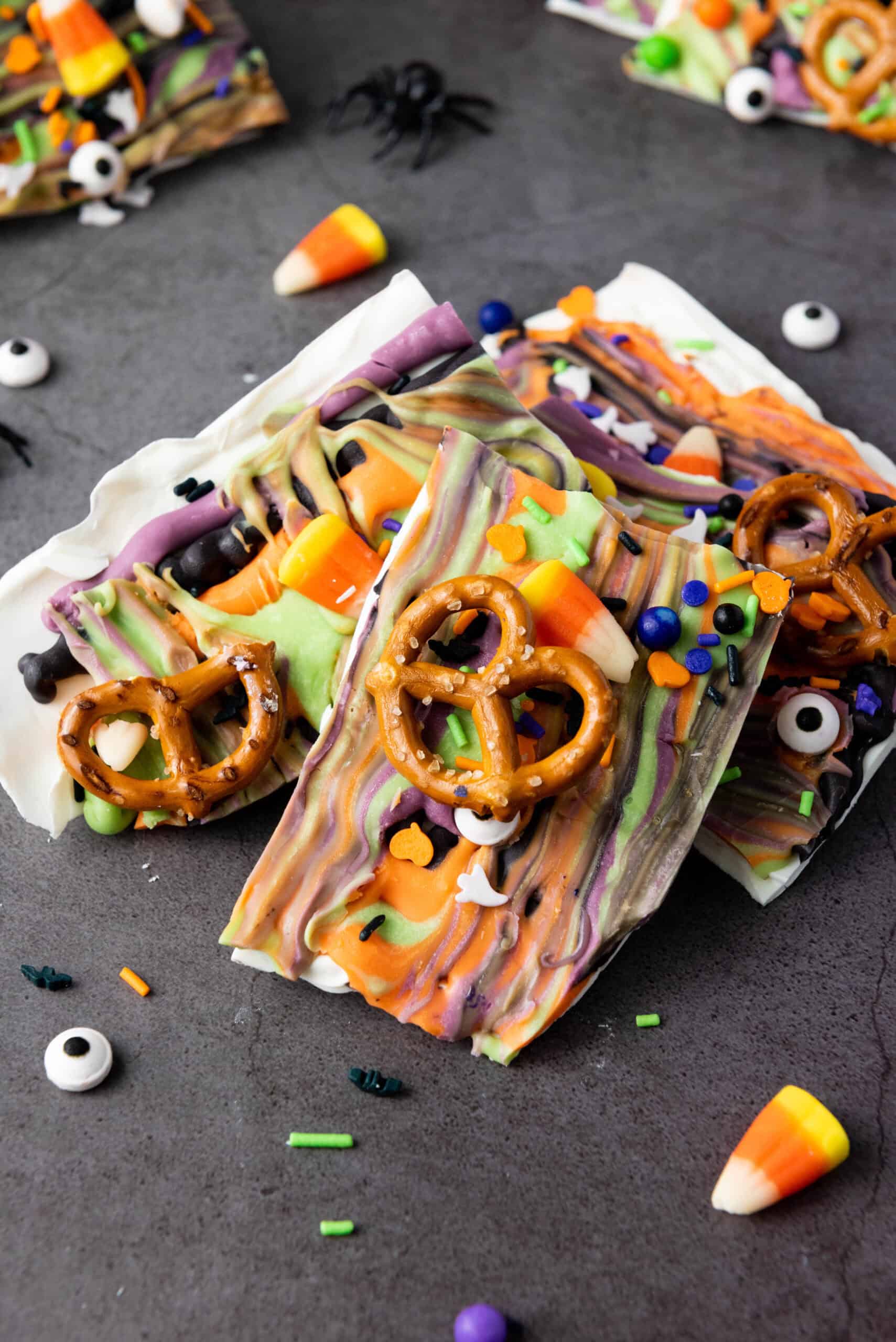 This Halloween Candy Bark is a fun and colorful no-bake treat made with candy melts, pretzels, candy corn, and sprinkles. Perfect for parties, gifting, or using up leftover Halloween candy!
