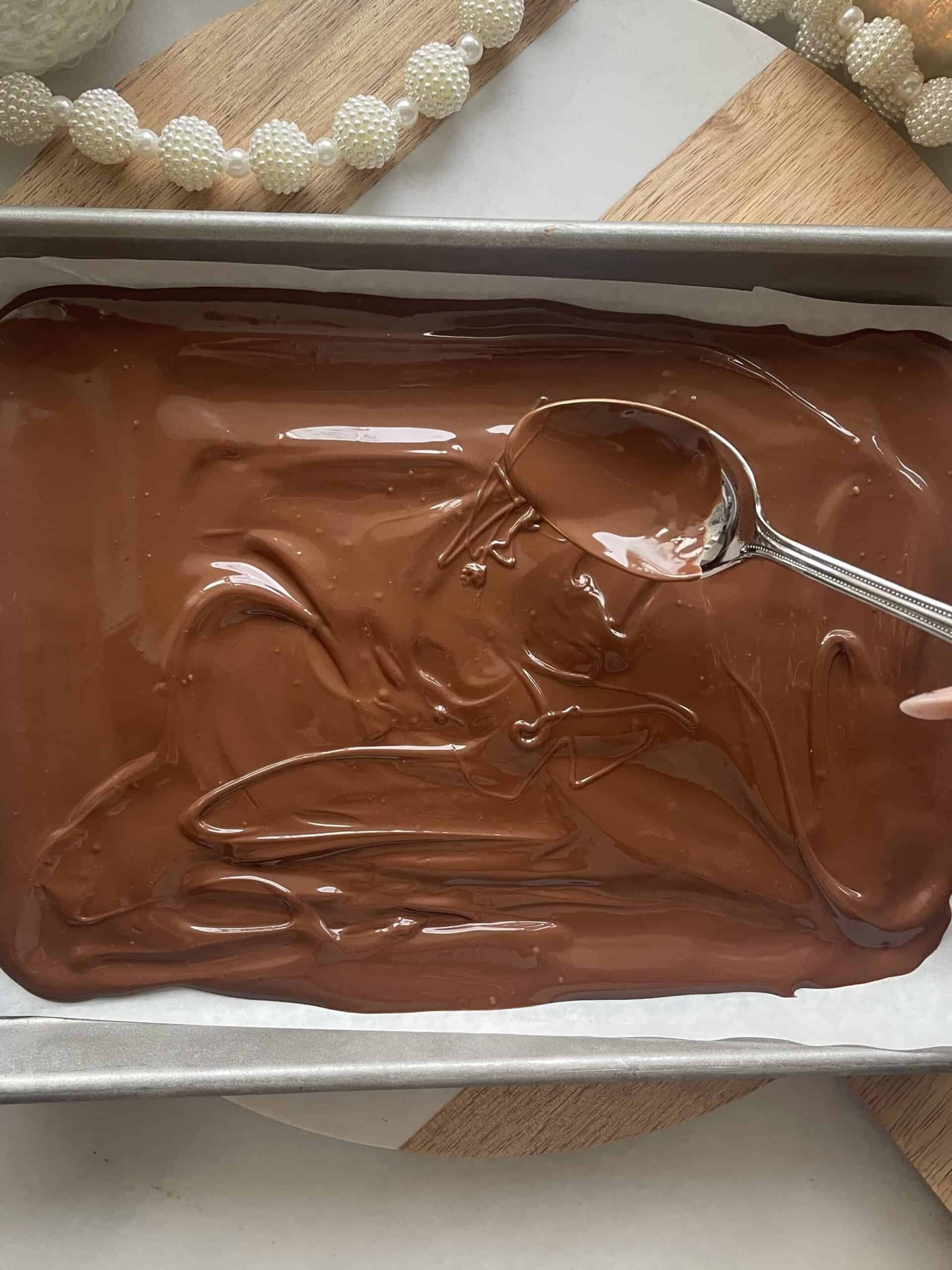 Spread the melted chocolate on top of the parchment paper lined baking sheet.