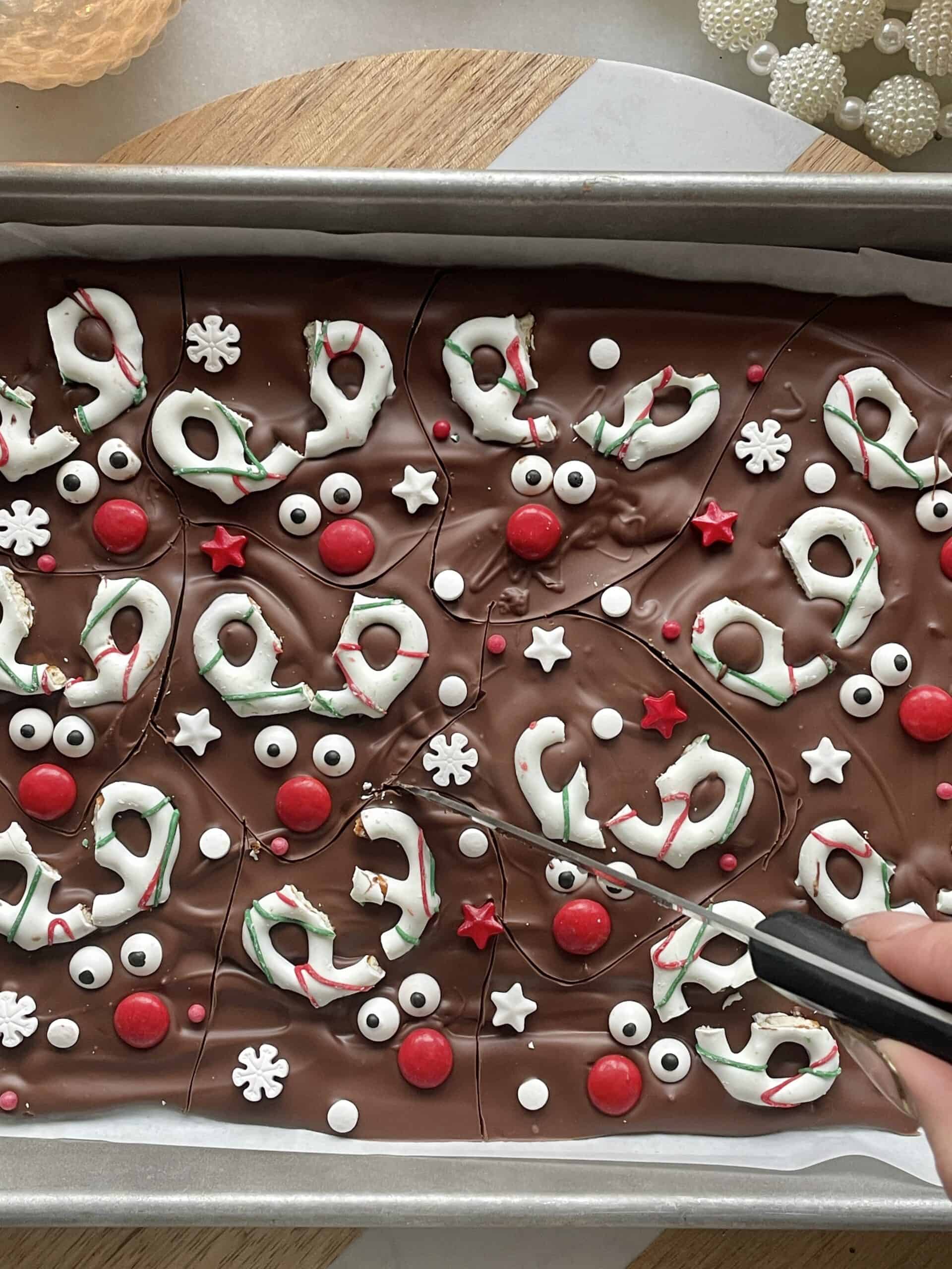 Refrigerate for 20 to 30 minutes or until fully set. With a knife cut into pieces, making sure each one has a full reindeer face. Enjoy how adorable they turned out.