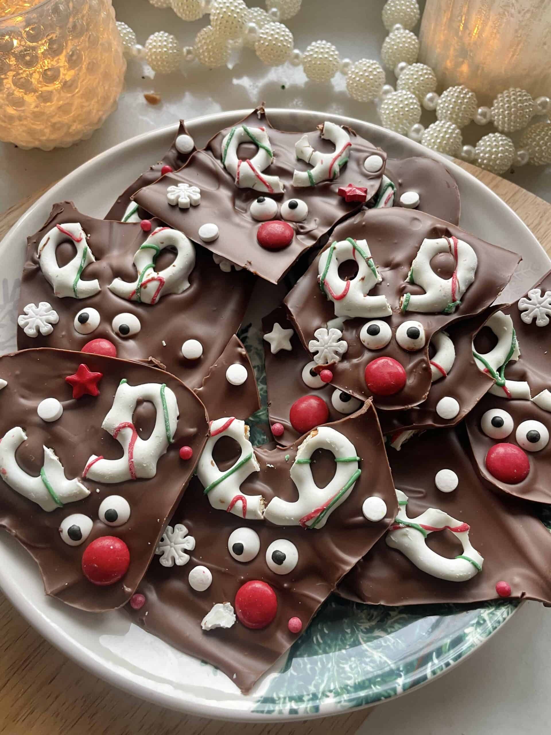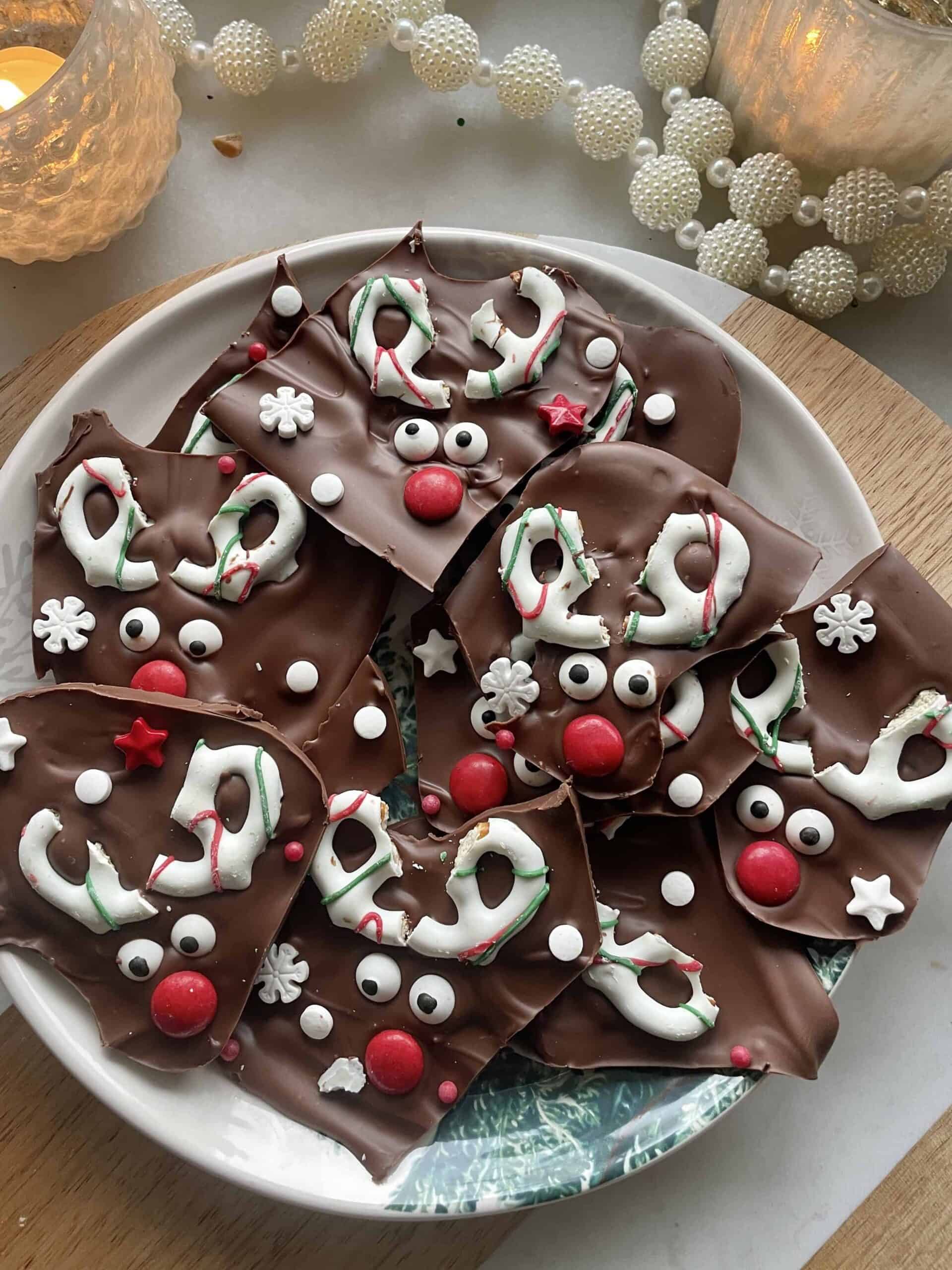 I adore this theme so turning chocolate bark into a whole cute Rudolph moment is one of the best aesthetic festive chocolate recipes. We love lazy girl DIY treats that look store-bought even when you throw it together in minutes.