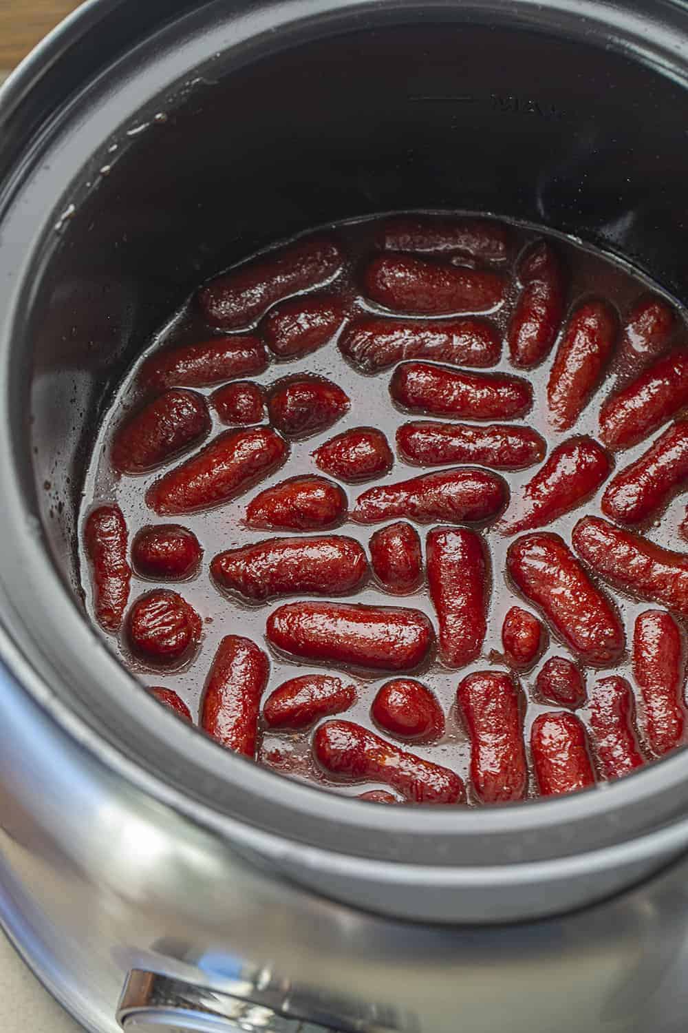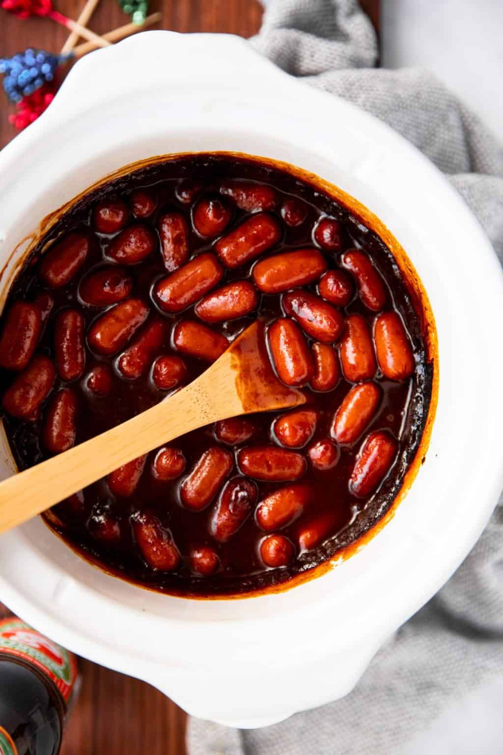The easiest way to cook little smokies for a party is in a slow cooker with your sauce of choice. Just add them in, set it to low for 2 to 3 hours, and they stay warm the whole time so guests can snack whenever.