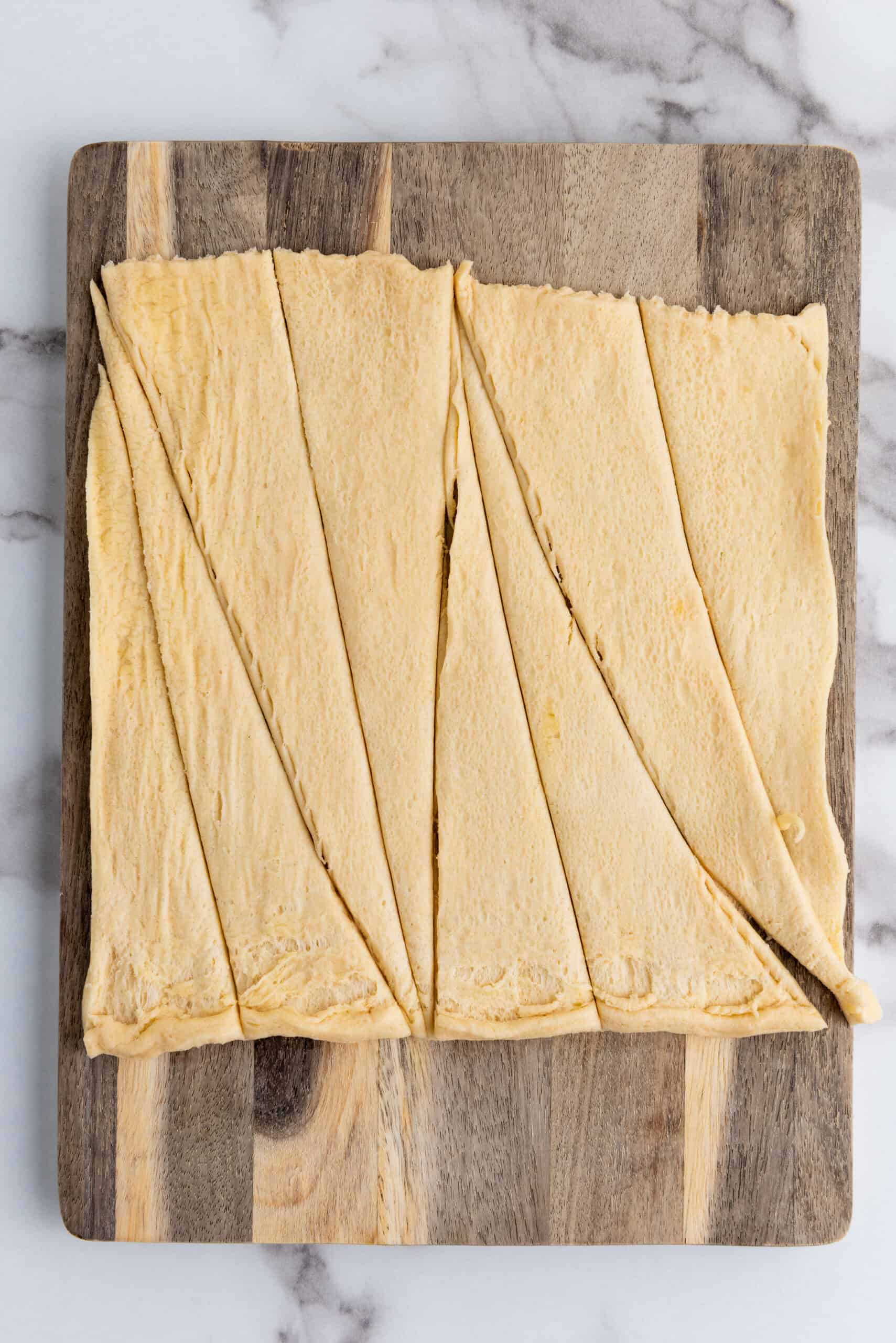Step 2: Unroll the croissant dough and separate it into 12 triangles. Cut each triangle in half to create 24 smaller pieces.