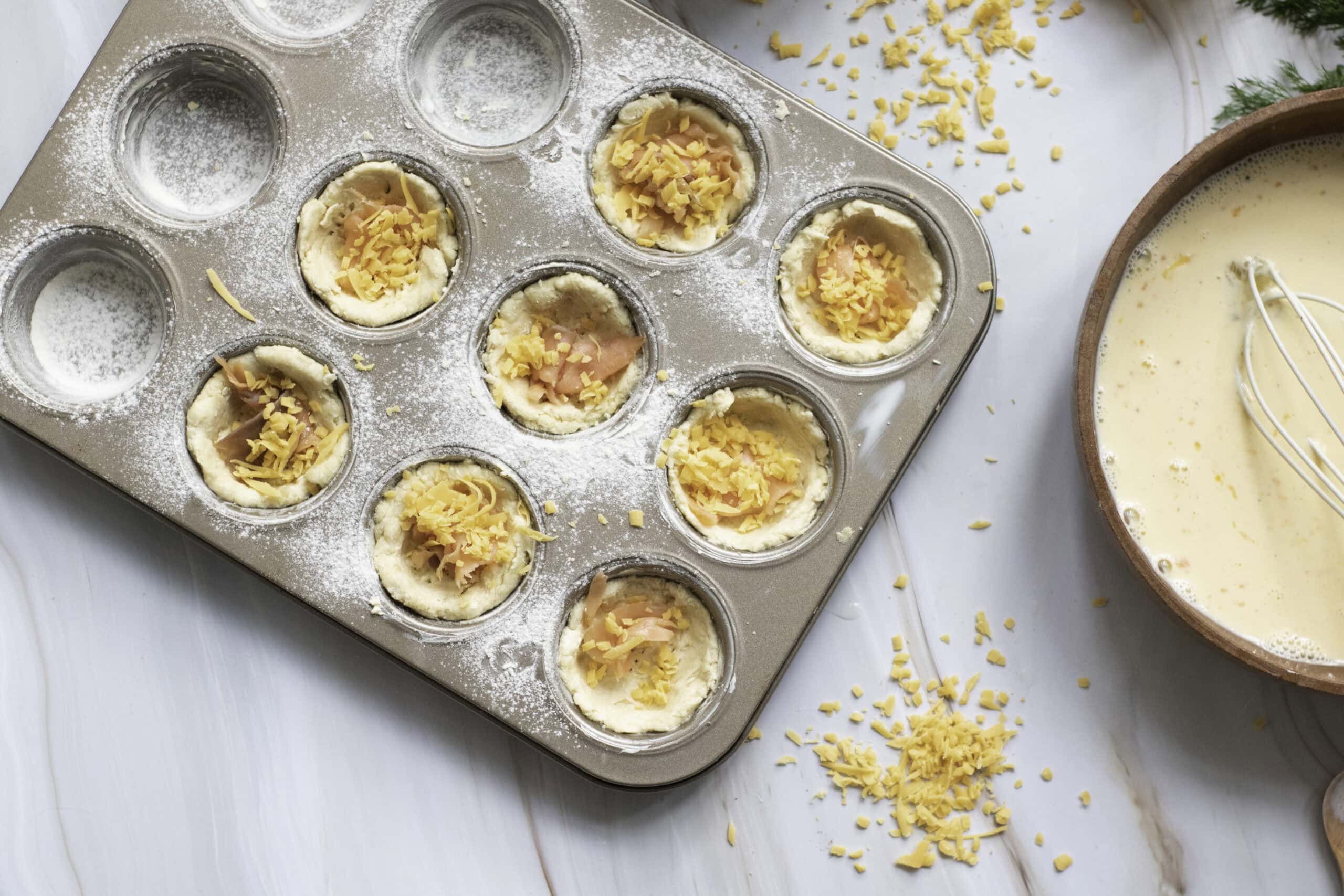 Place a small amount of chopped salmon and grated cheese into each mini crust.