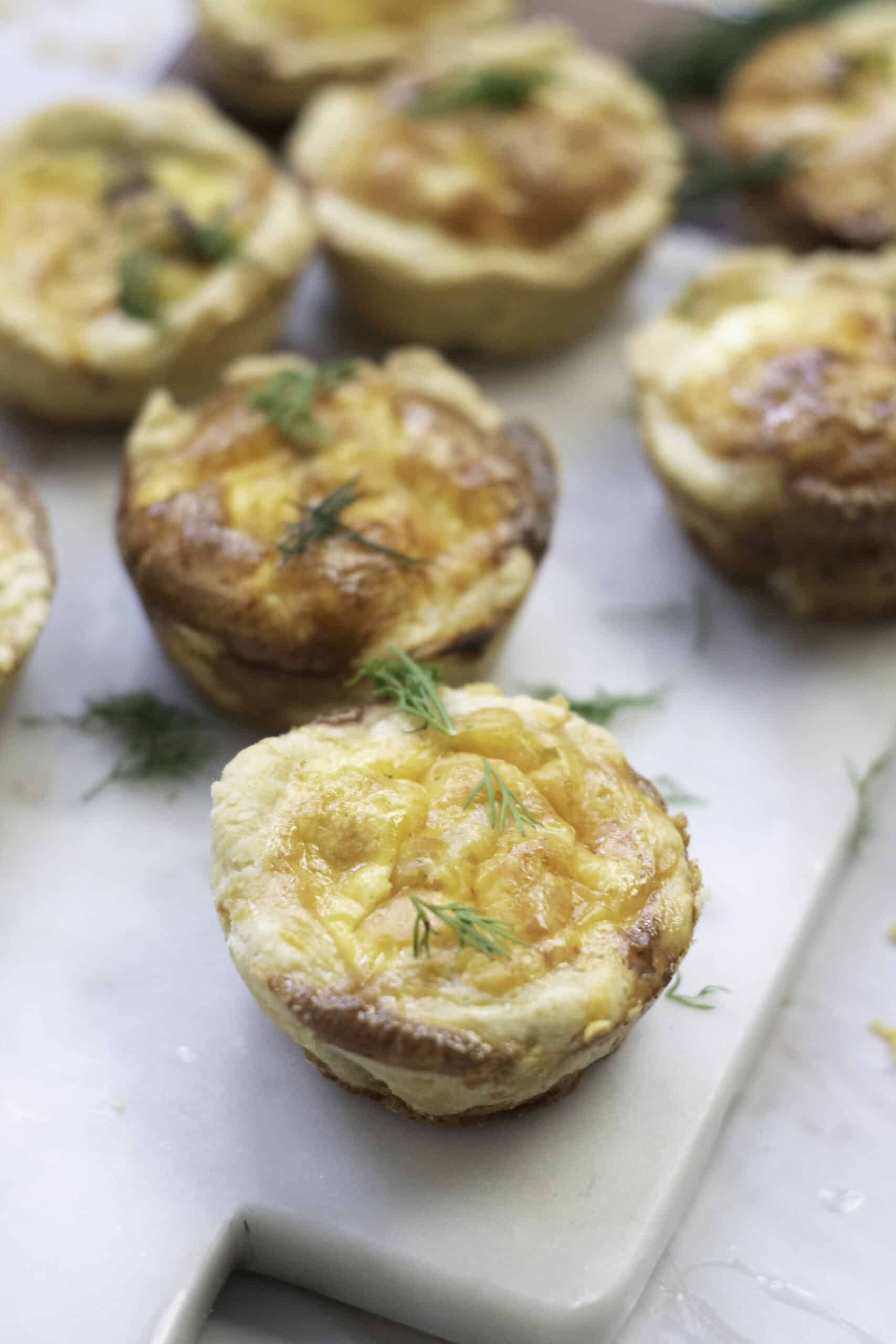 Step 4: Let the quiches cool slightly, then remove from the tin and garnish with fresh dill. Serve warm or at room temperature.