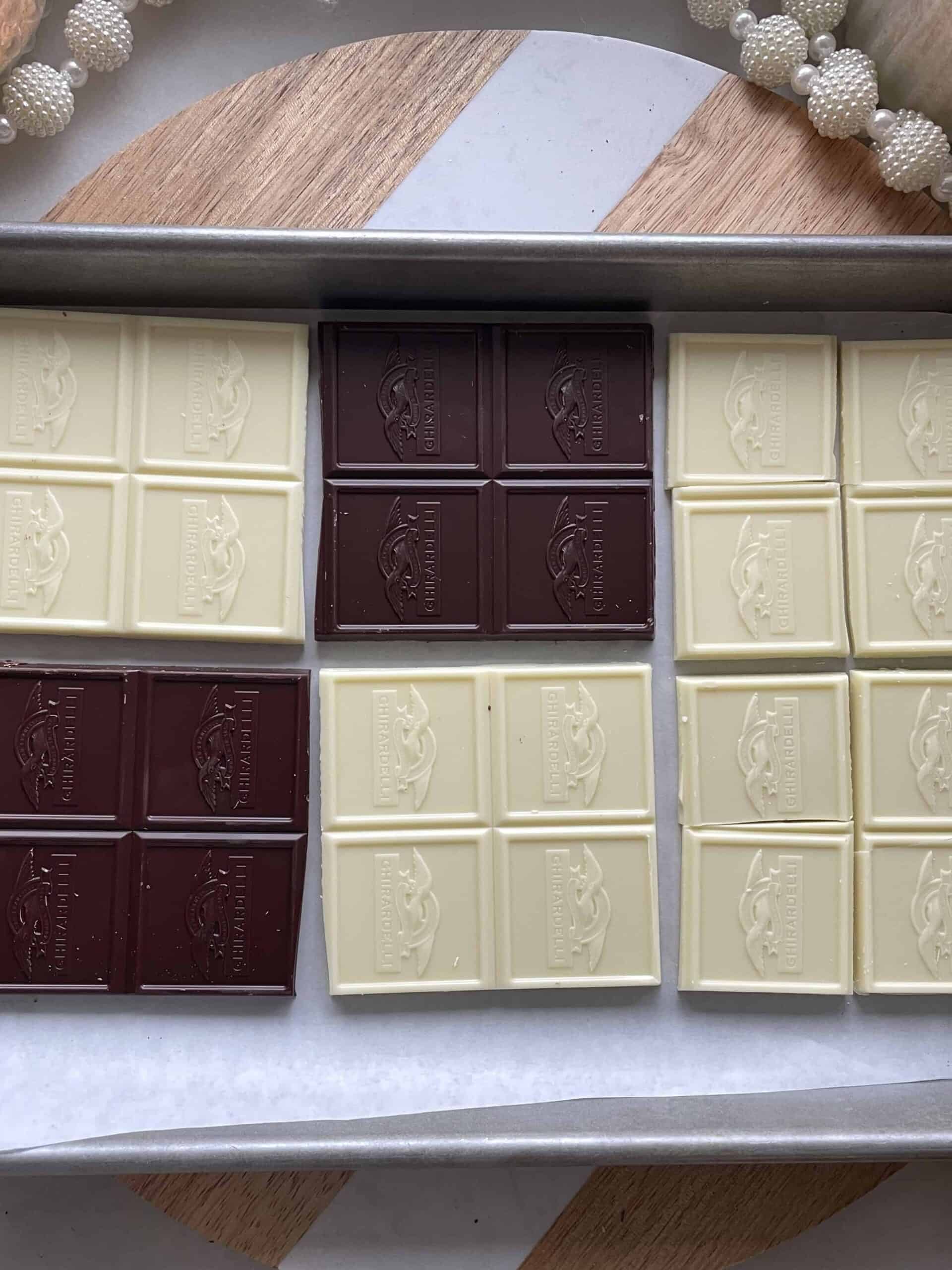 Melt the white and milk chocolate separately in the microwave or using a double boiler, stirring until smooth and creamy. Heat slowly so the chocolate doesn't scorch.