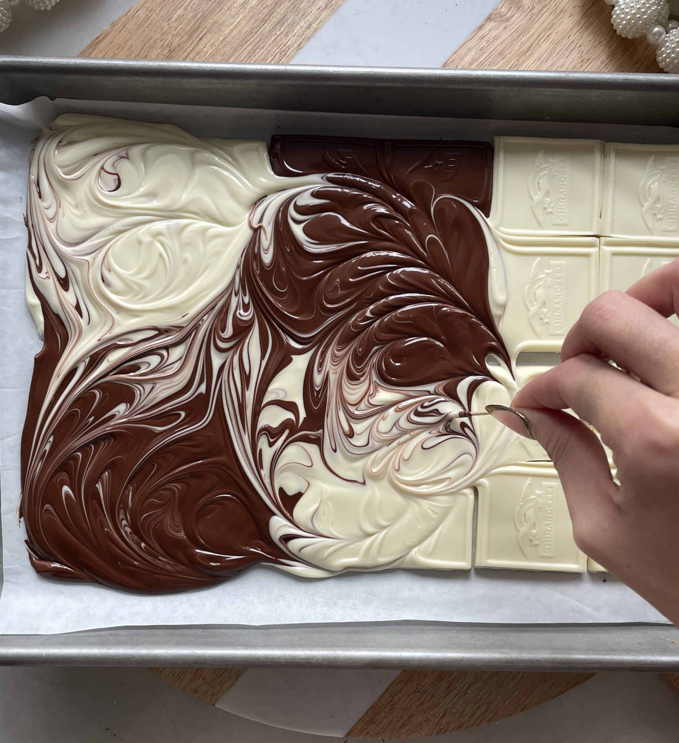 Remove the softened chocolate bars from the oven. Make swirls in the chocolate to blend the colors together.