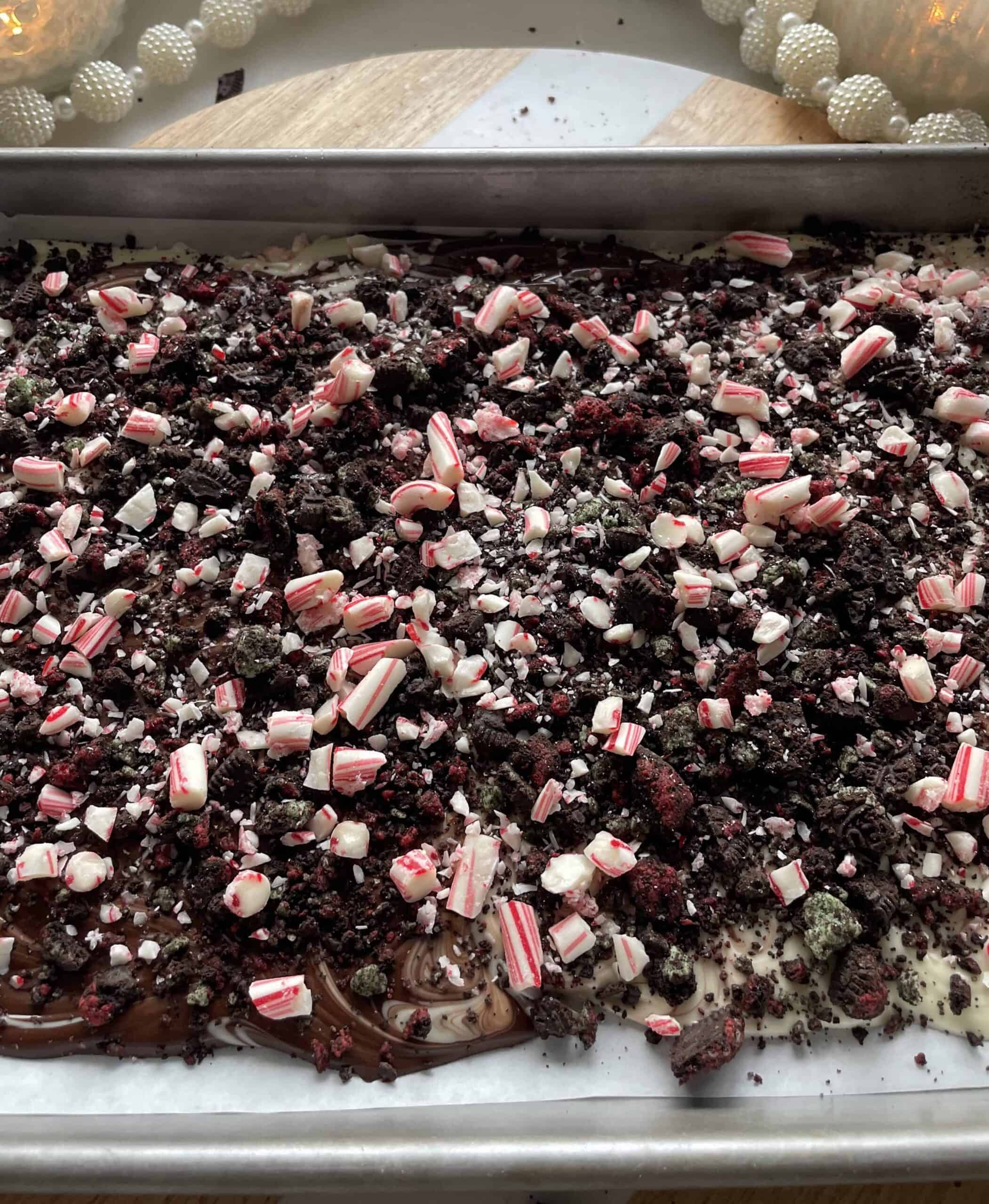 Sprinkle the crushed Oreos and crushed candy canes over the chocolate as desired, going as light or heavy as you want.