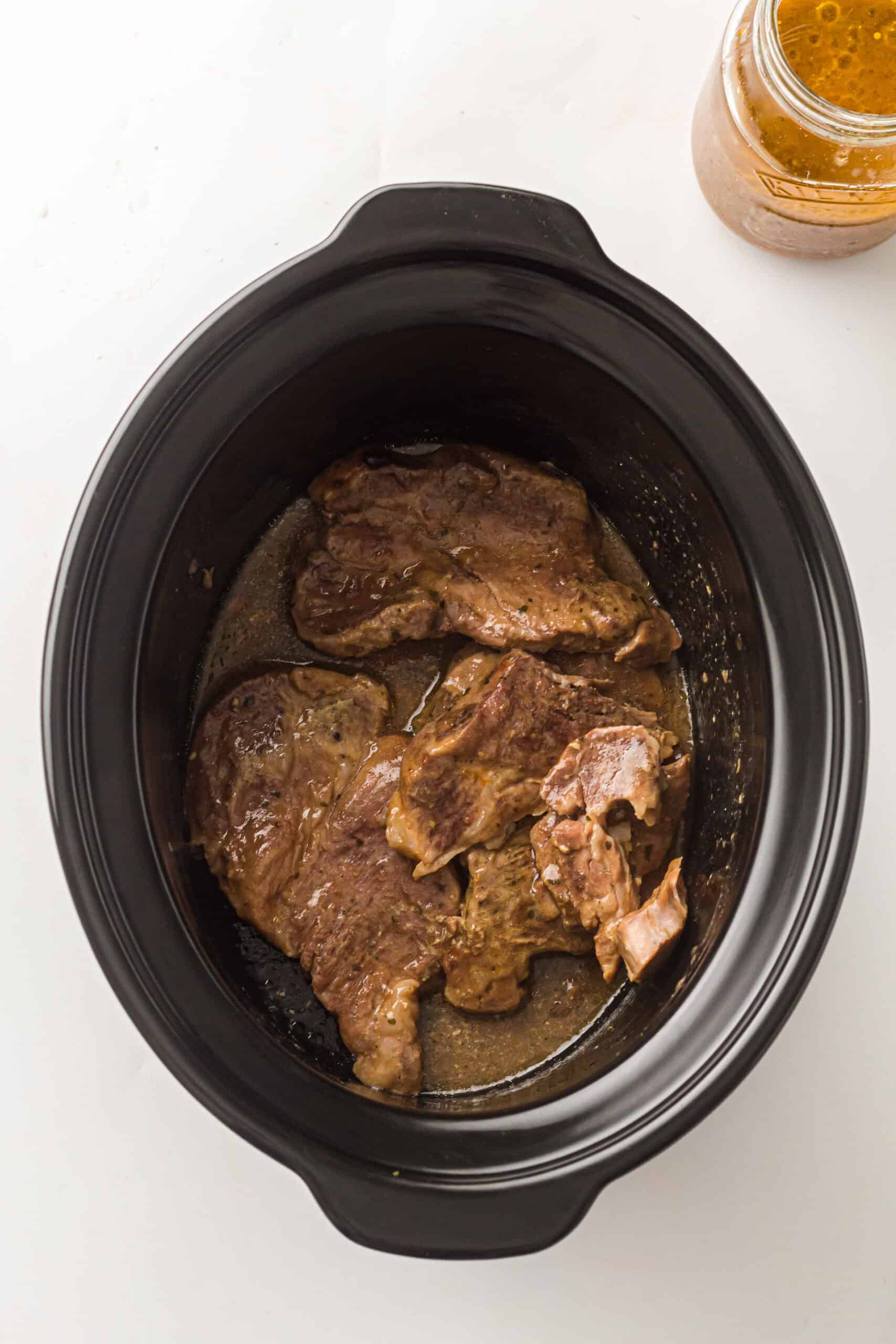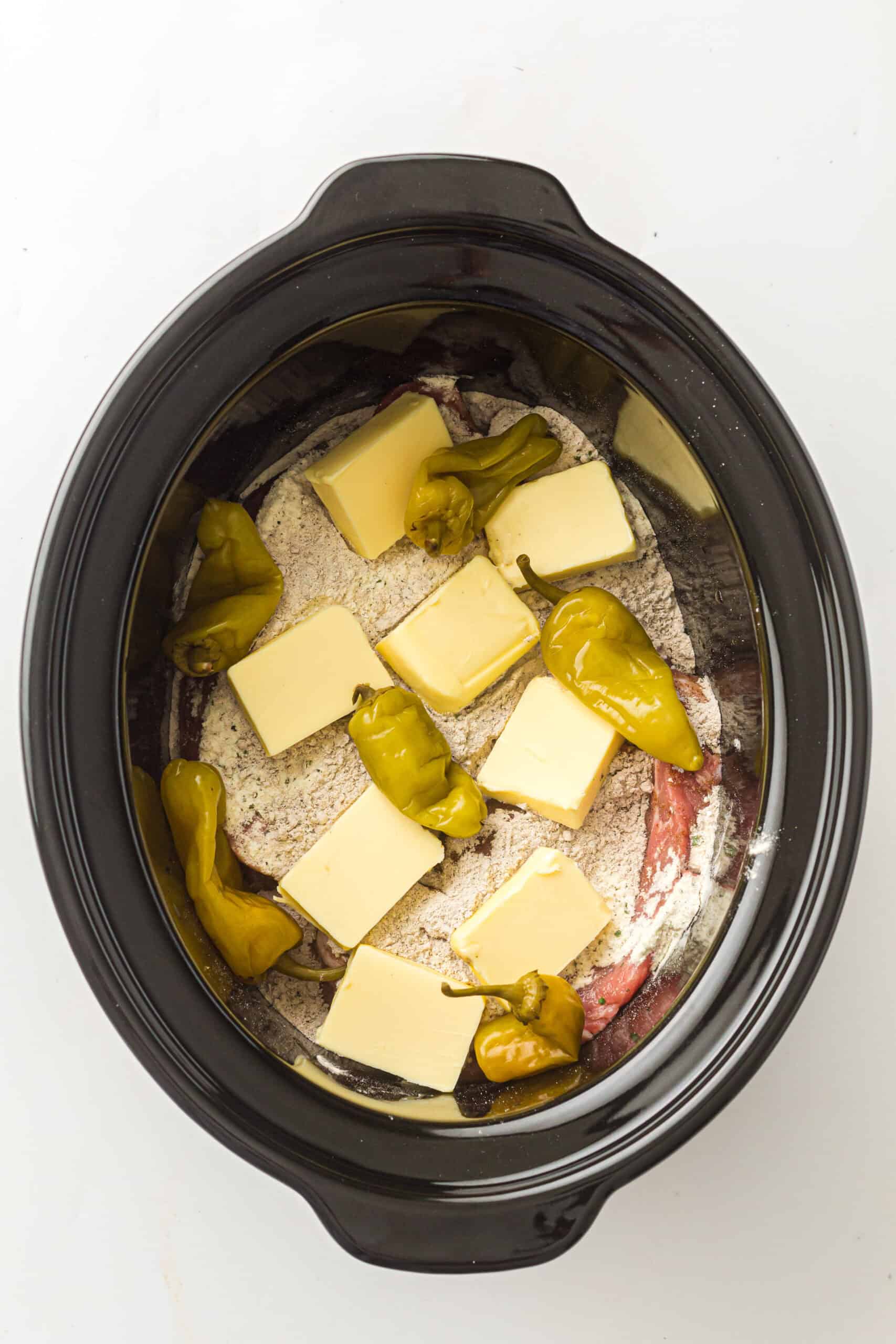 Step 3: Add the pepperoncini peppers on and around the pork. Pour in two tablespoons of the pepper brine for extra flavor. If your slow cooker runs hot, add a splash of water or broth.