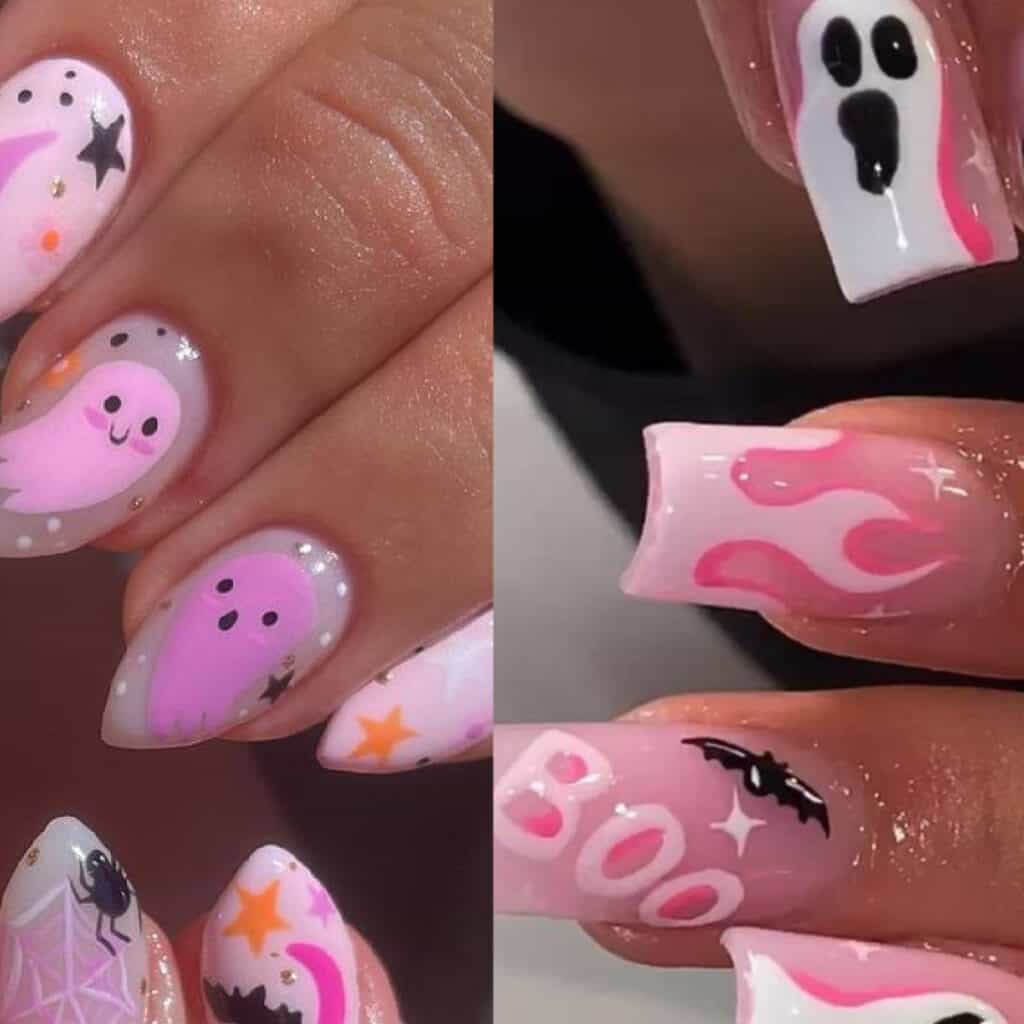 16. Cute Pink Pumpkin & Ghost Nail Art