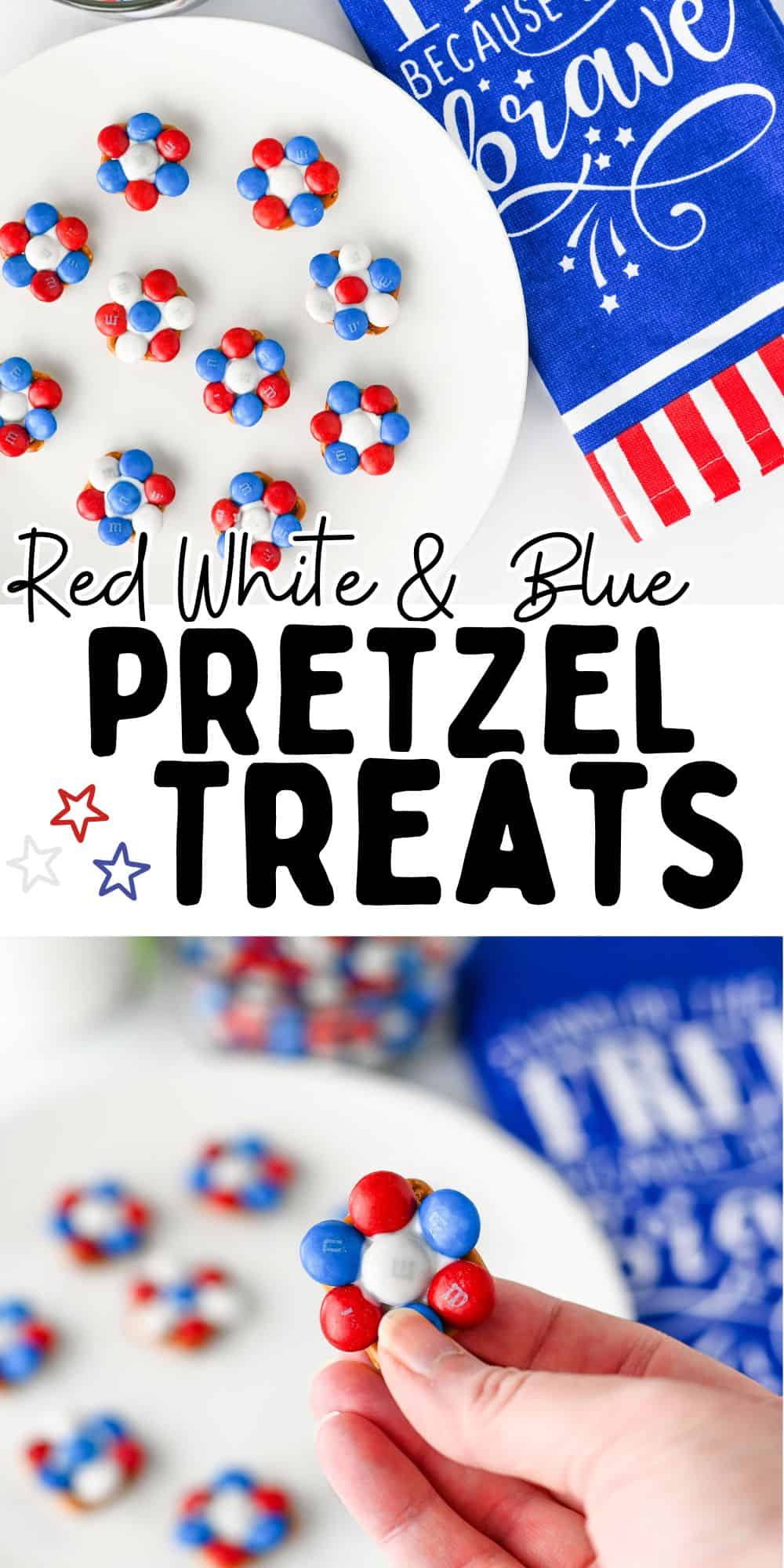 These red white and blue chocolate pretzels are an easy, patriotic snack made with crunchy pretzels, melted chocolate, and festive M&M's. Perfect for a quick 4th of July treat or party dessert.