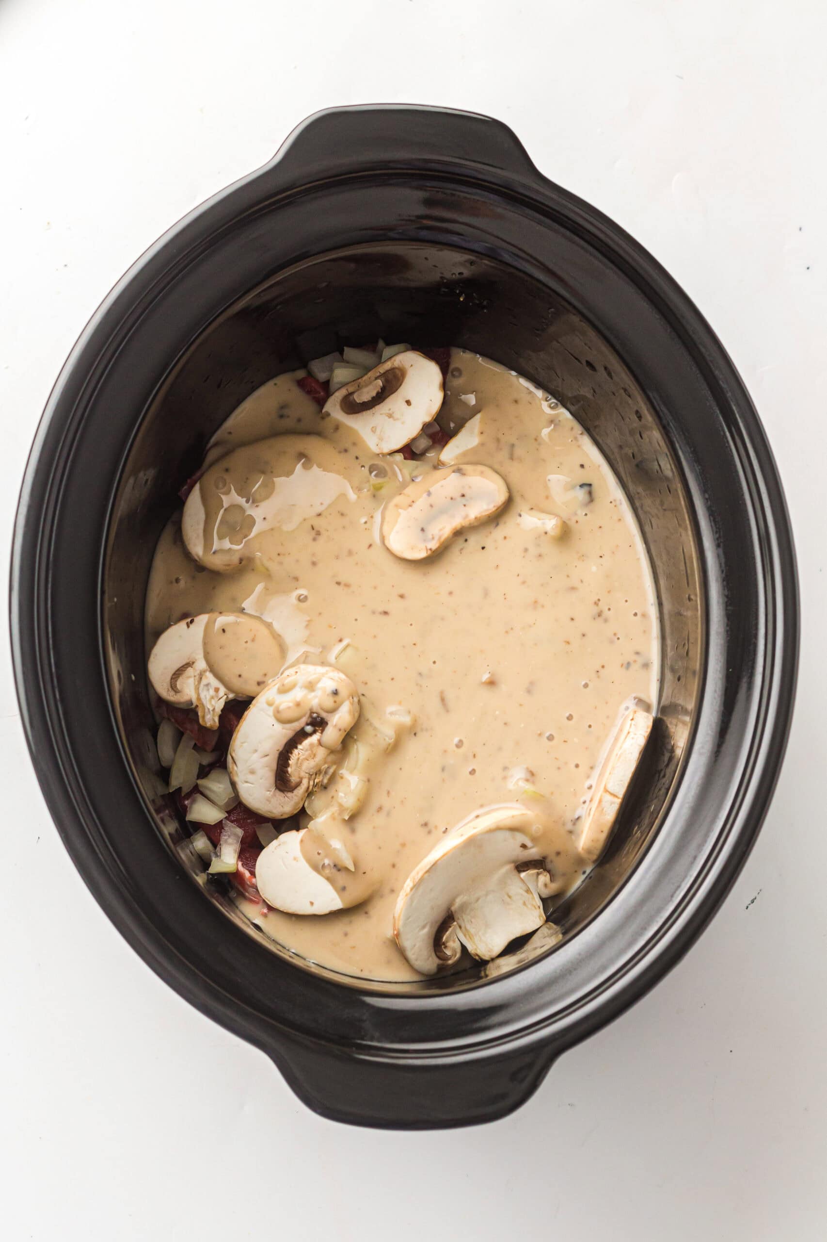 Step 2: Add sliced mushrooms on top if using. They cook down beautifully and add that classic stroganoff flavor.