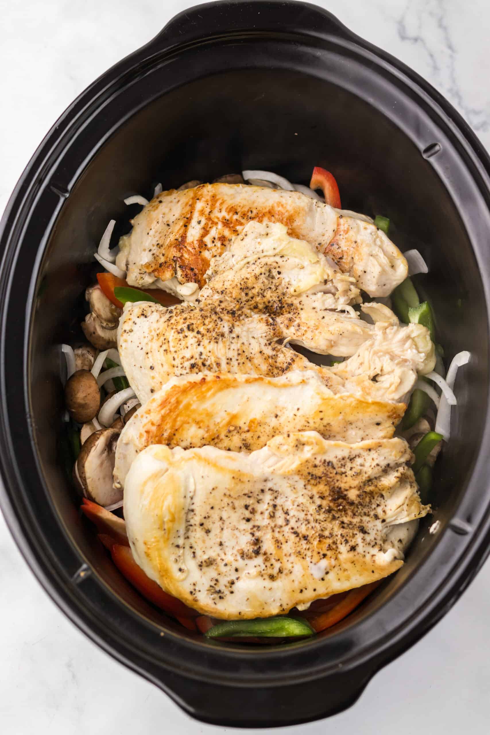 Add the onion, peppers, mushrooms, and garlic to the bottom of the slow cooker. Place the seared chicken on top.