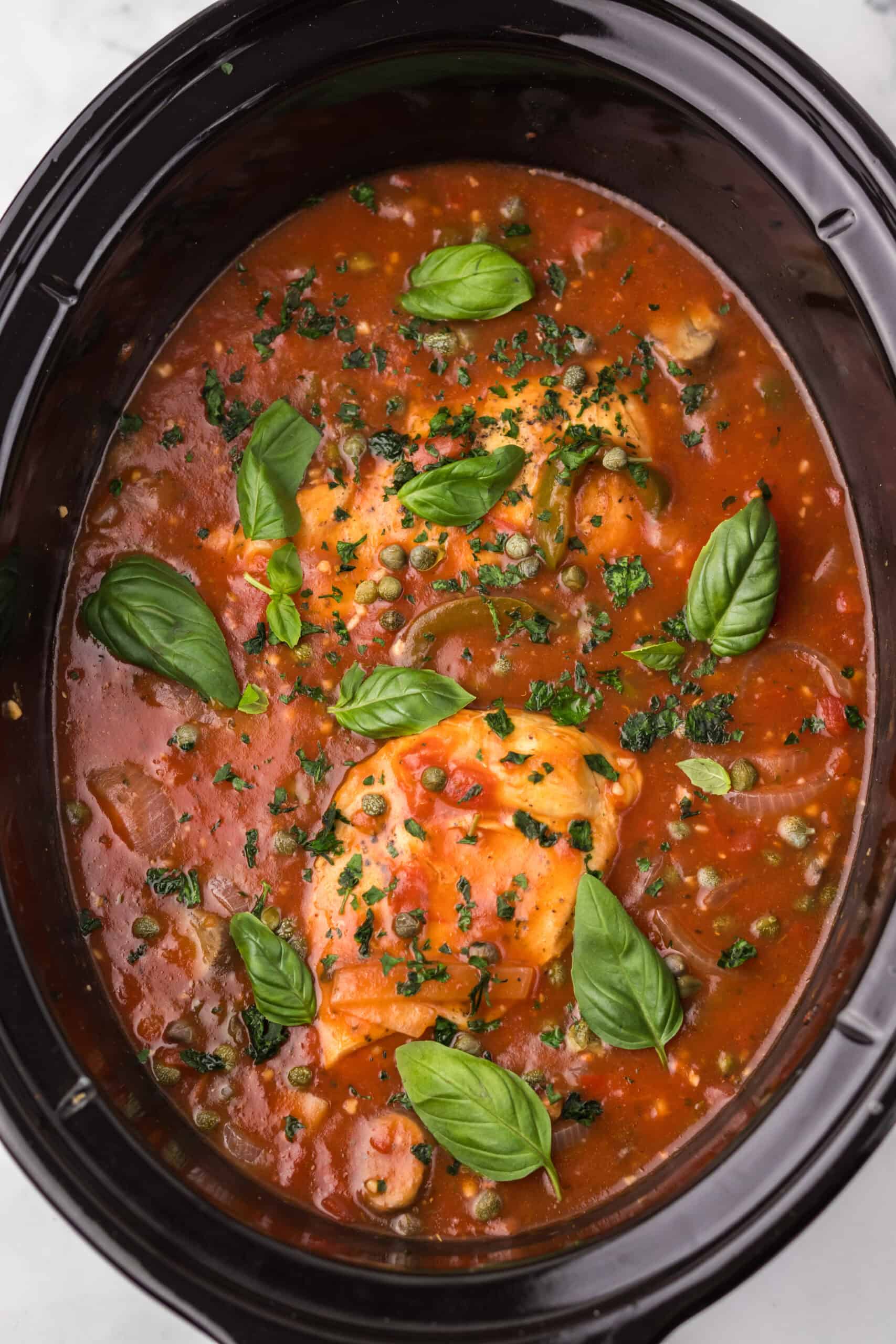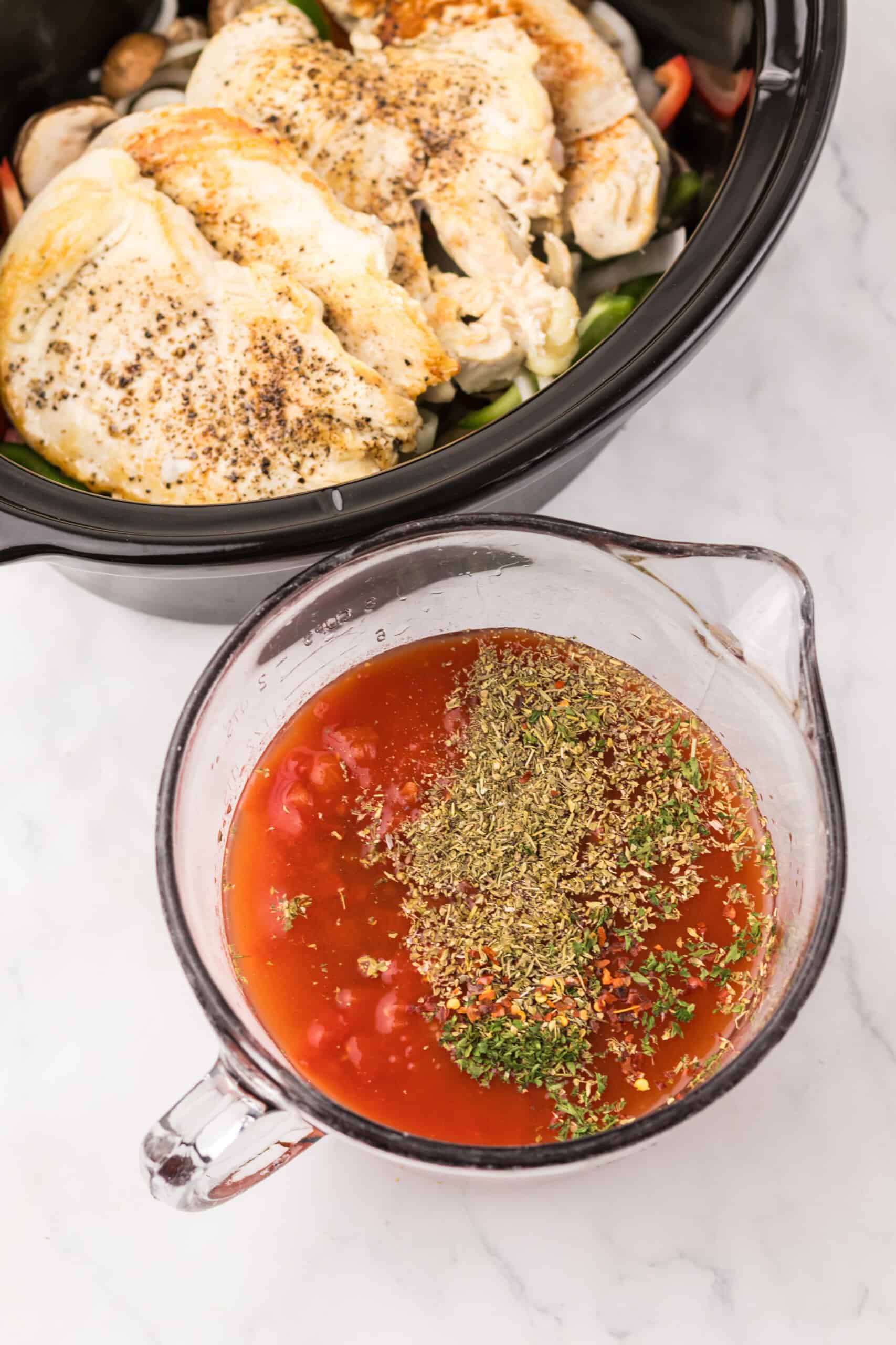 Step 3: In a separate bowl, mix the crushed tomatoes, drained diced tomatoes, chicken broth, Italian seasoning, basil, oregano, red pepper flakes, and a bit more salt and pepper. Pour the mixture over the chicken. Cover and cook on low for 6 to 7 hours or on high for 3 to 4 hours until the chicken is tender.