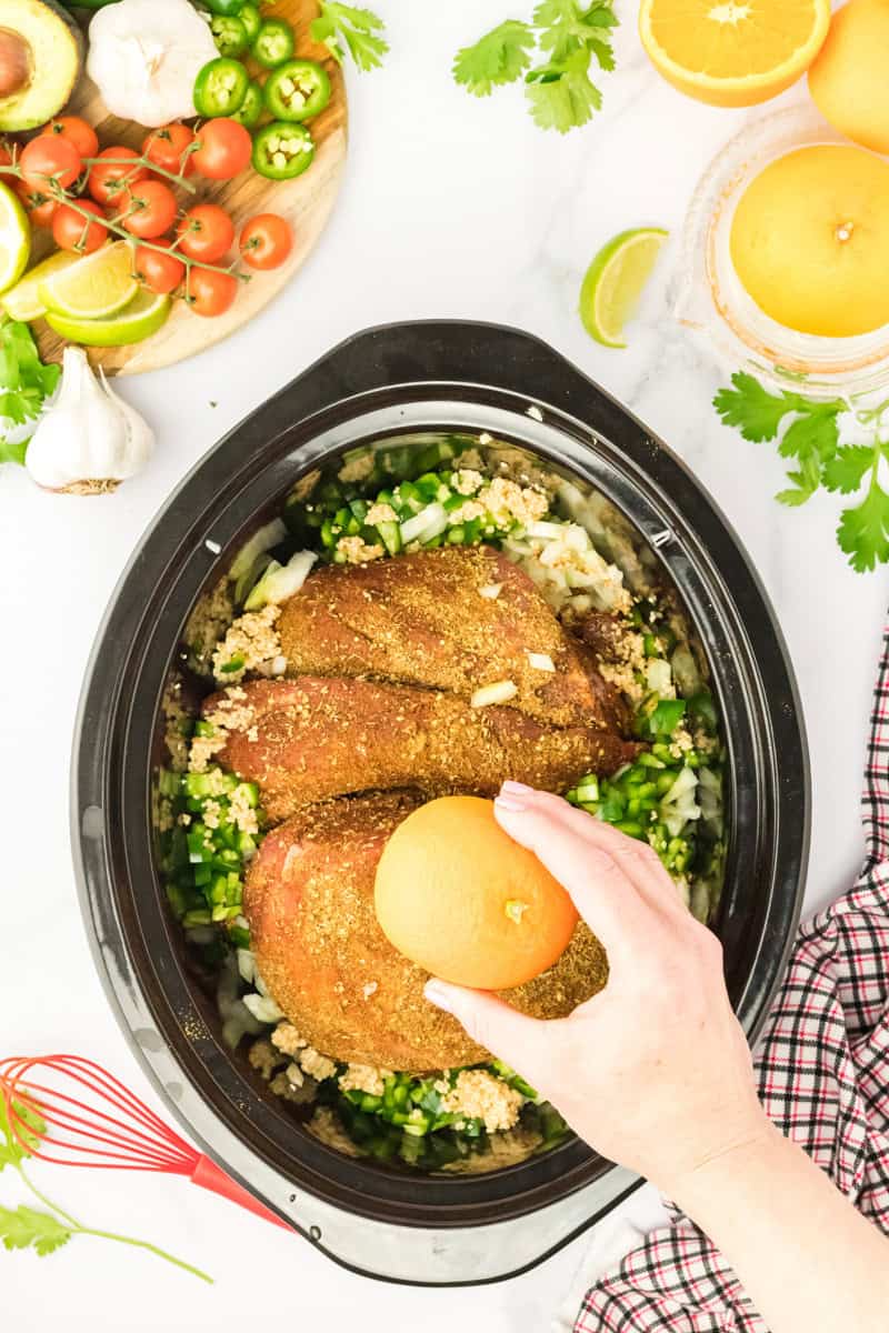 Add the diced onion, garlic, and jalapeรฑo around the pork. Squeeze the juice from both oranges over the top.