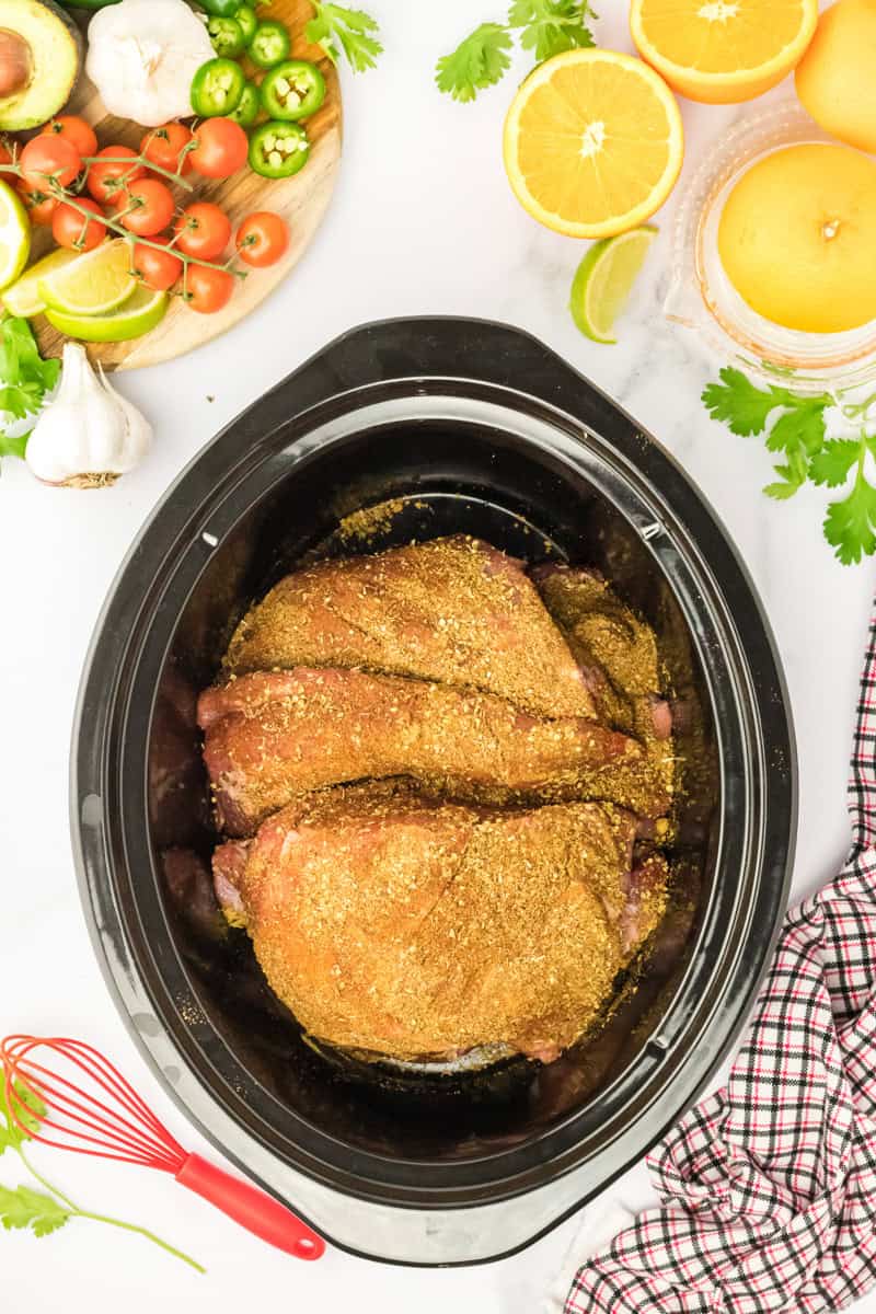 Step 2: Rub the spice mixture all over the pork, pressing it in so it sticks. Place the seasoned pork into the slow cooker.