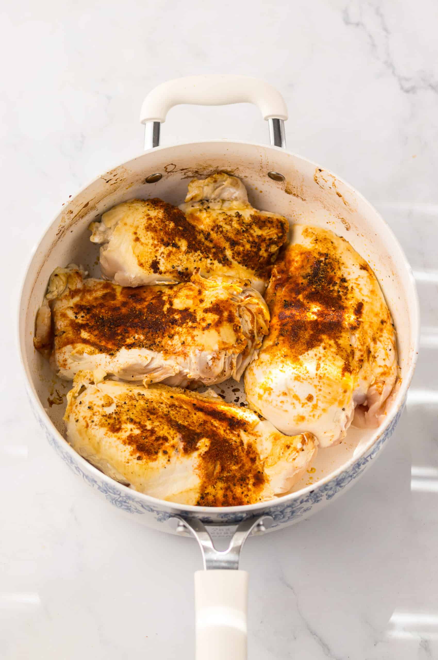 Step 2: Season chicken breasts with garlic powder, paprika, and black pepper. Quickly sear in the same skillet until browned on both sides (don't fully cook).