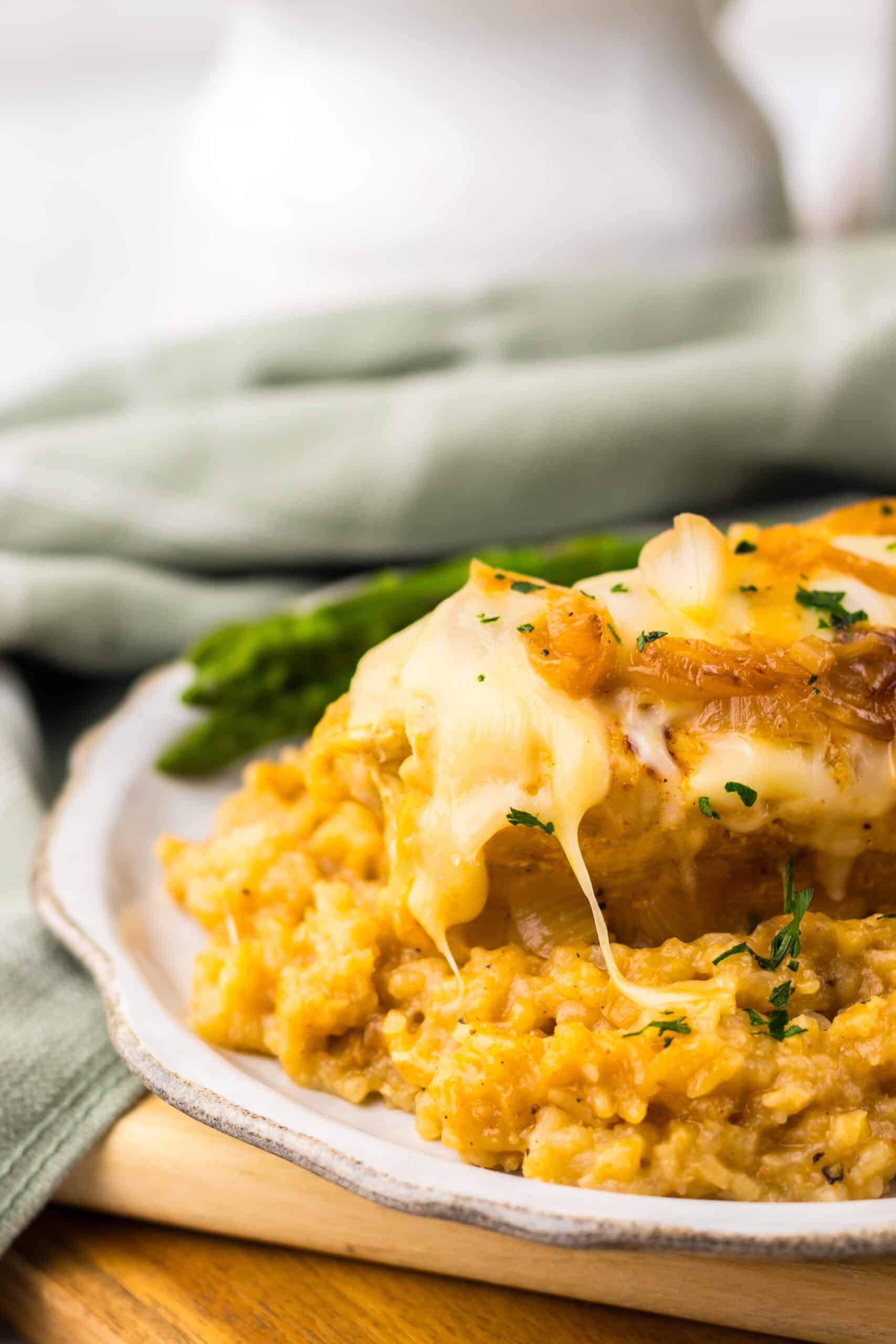 This Slow Cooker French Onion Chicken and Rice is creamy, cheesy, and full of cozy flavor. Juicy chicken slow cooks in a rich onion sauce with tender rice and melted Swiss cheese. It's the perfect hands-off dinner for busy nights or relaxing weekends.