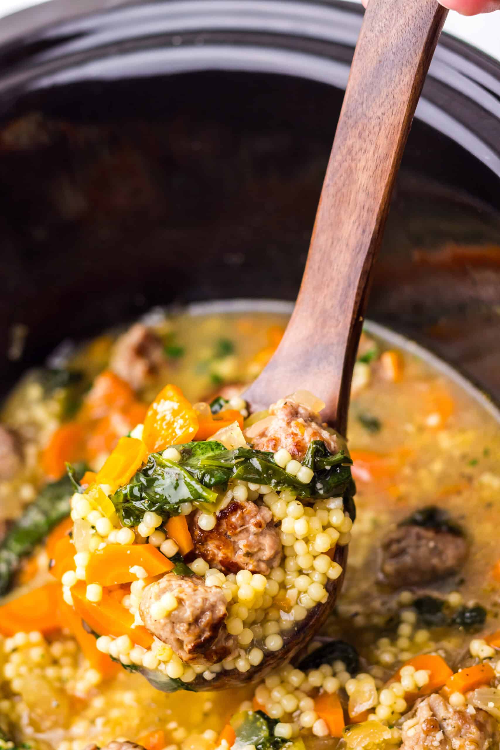 This Slow Cooker Italian Wedding Soup is cozy, flavorful, and full of classic comfort. Juicy Italian sausage meatballs, tender pasta, and fresh spinach come together in a rich, savory broth that's both hearty and light. It's the kind of meal that feels homemade without all the extra effort.