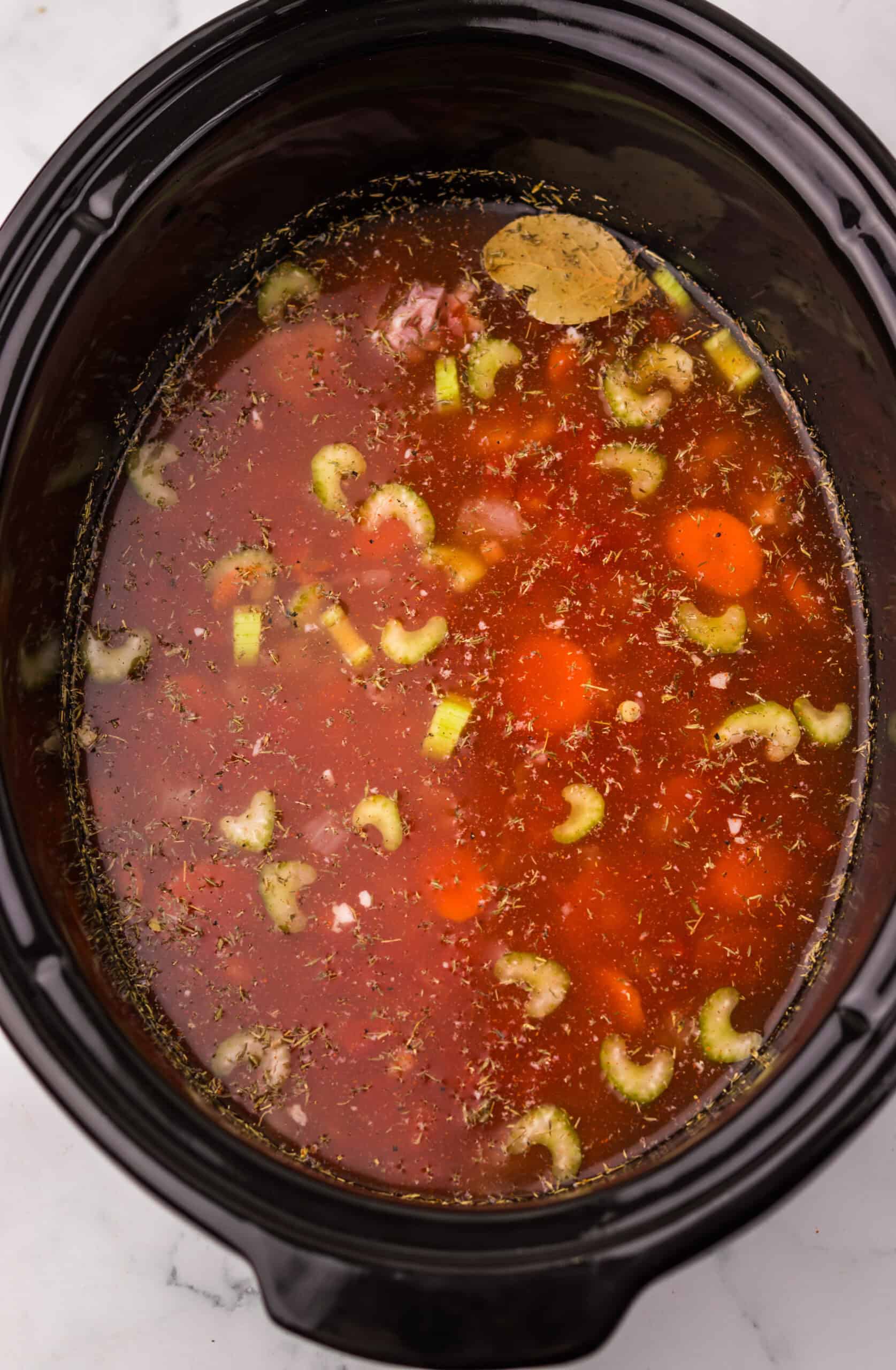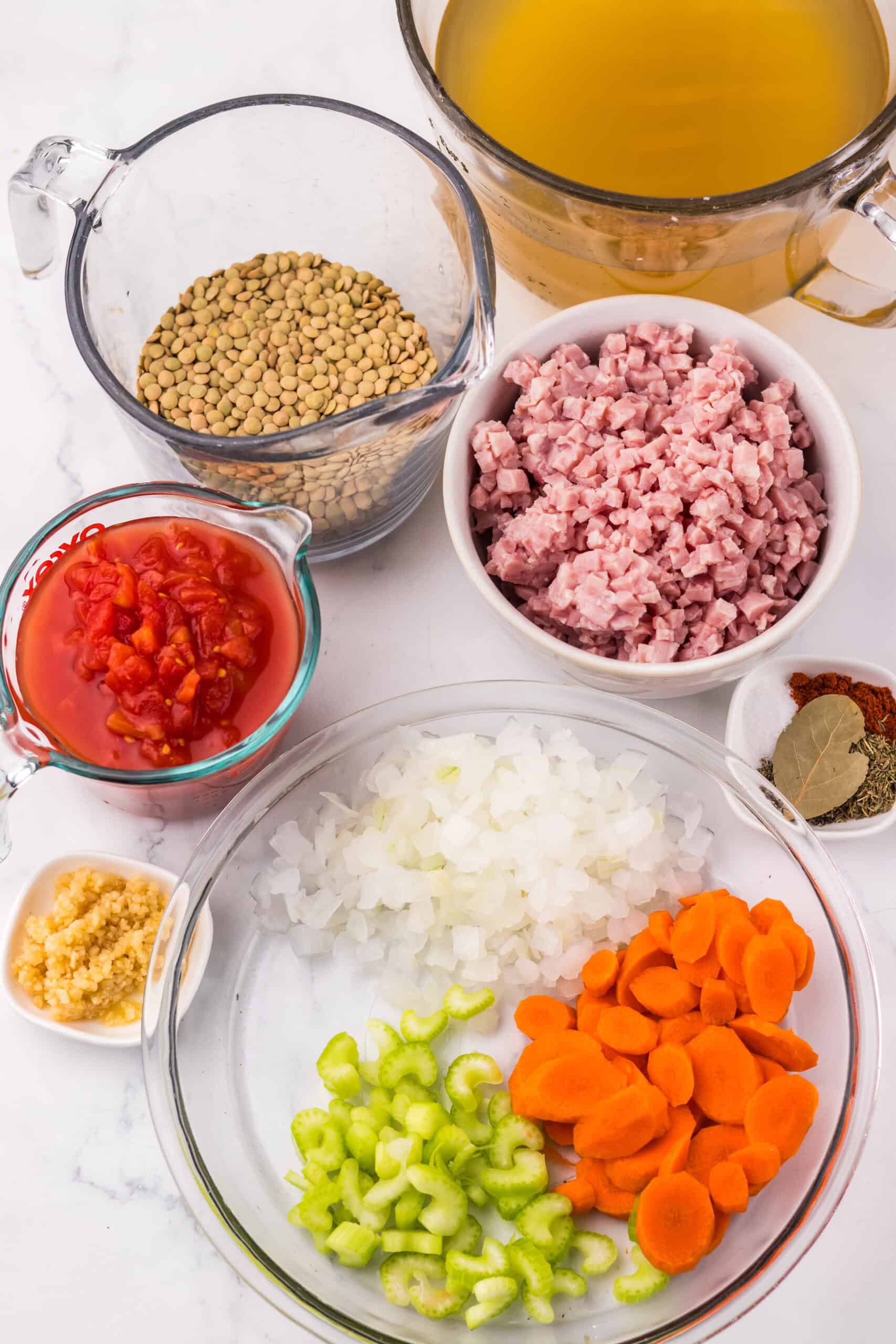 Step 1: Add all ingredients to the slow cooker-ham, lentils, onion, carrots, celery, garlic, tomatoes, broth, and seasonings.