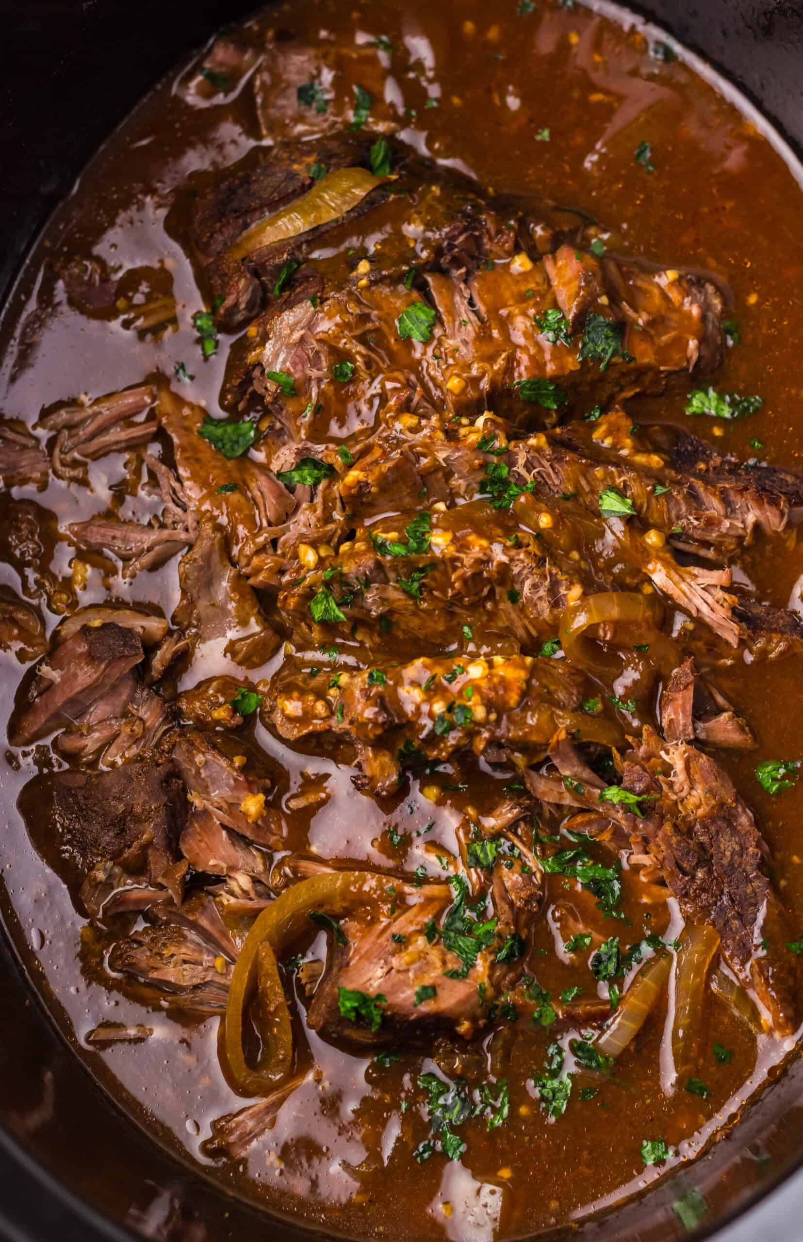 Slice beef against the grain, return to the gravy, and garnish with parsley before serving.