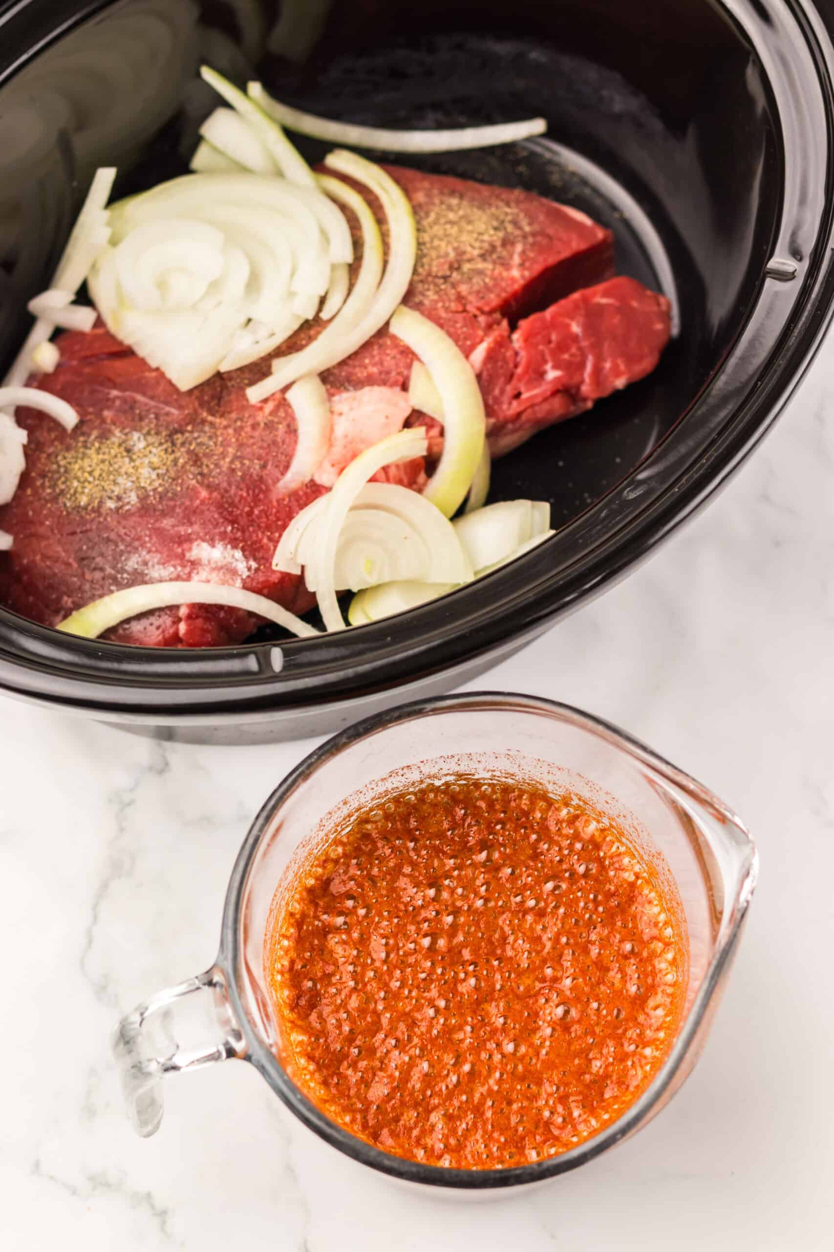 Step 2: In a bowl, whisk together the Dr Pepper, beef broth, ketchup, brown sugar, Worcestershire sauce, soy sauce, onion powder, and smoked paprika. Pour the mixture over the beef until well coated.