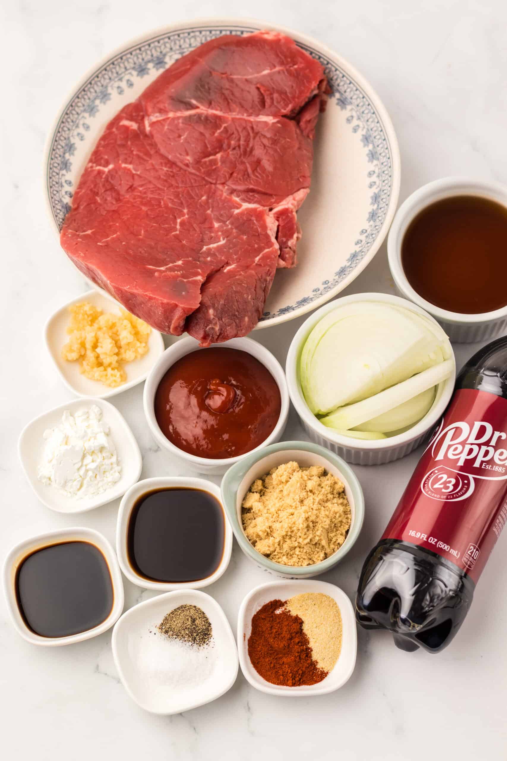 Whisk together Dr Pepper, beef broth, ketchup, brown sugar, Worcestershire sauce, soy sauce, onion powder, and smoked paprika. Pour over the beef.