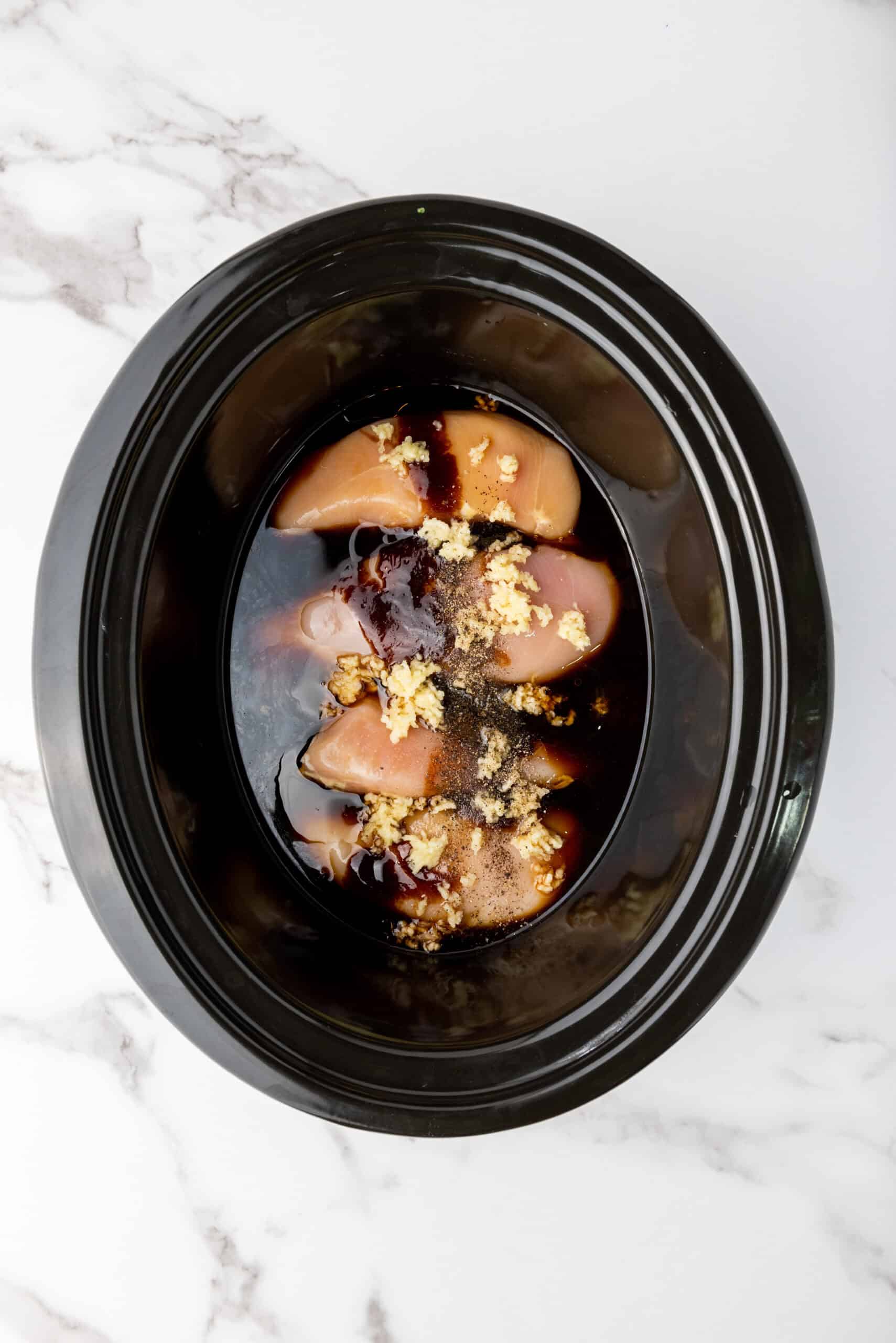 Step 2: Add the chicken breasts to the slow cooker, then pour in soy sauce, honey, hoisin sauce, rice vinegar, sesame oil, and the grated garlic. Season with salt and pepper. Stir until everything is evenly coated.