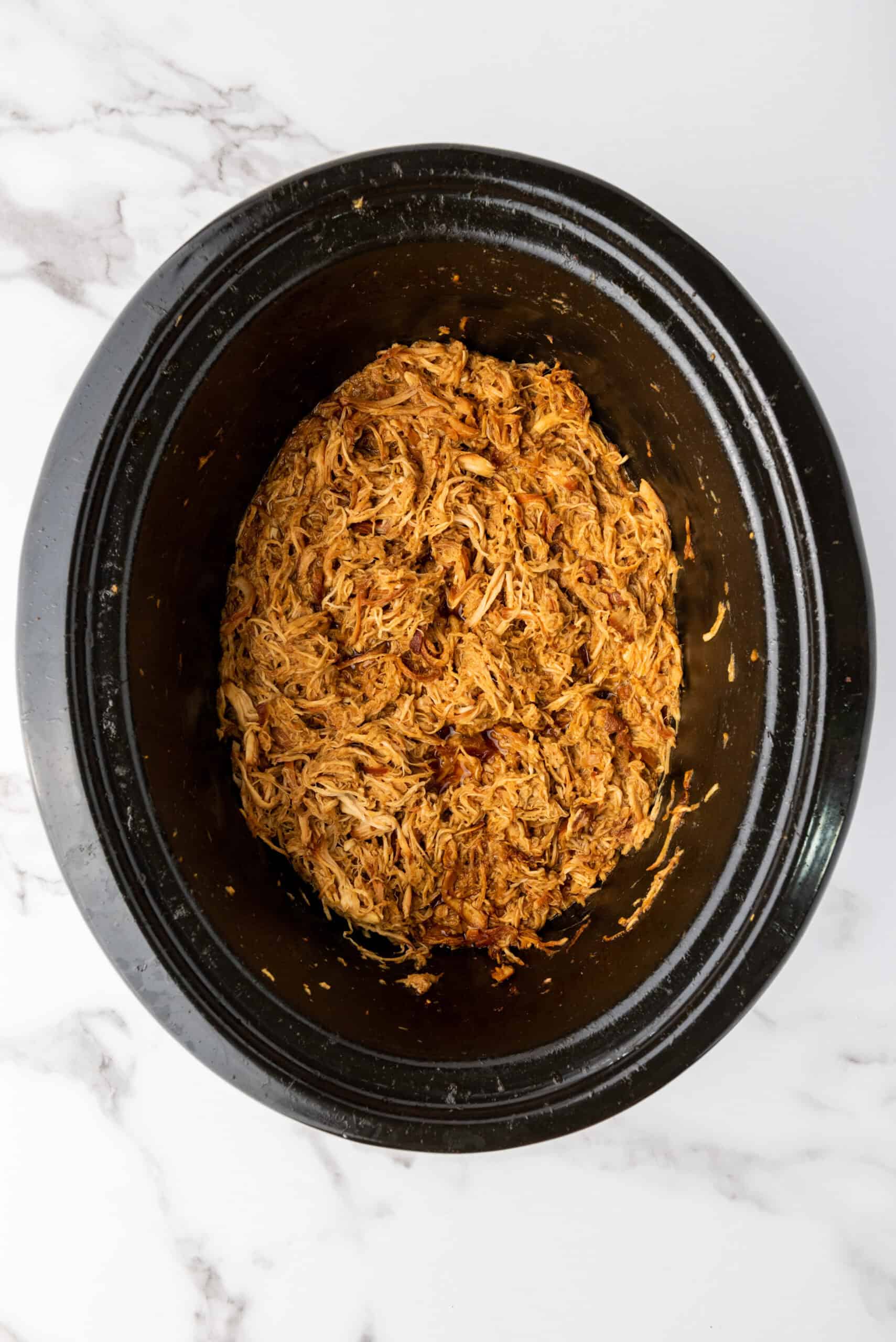 Step 4: Once cooked, use two forks or a hand mixer to shred the chicken right in the slow cooker so it soaks up all that sauce.