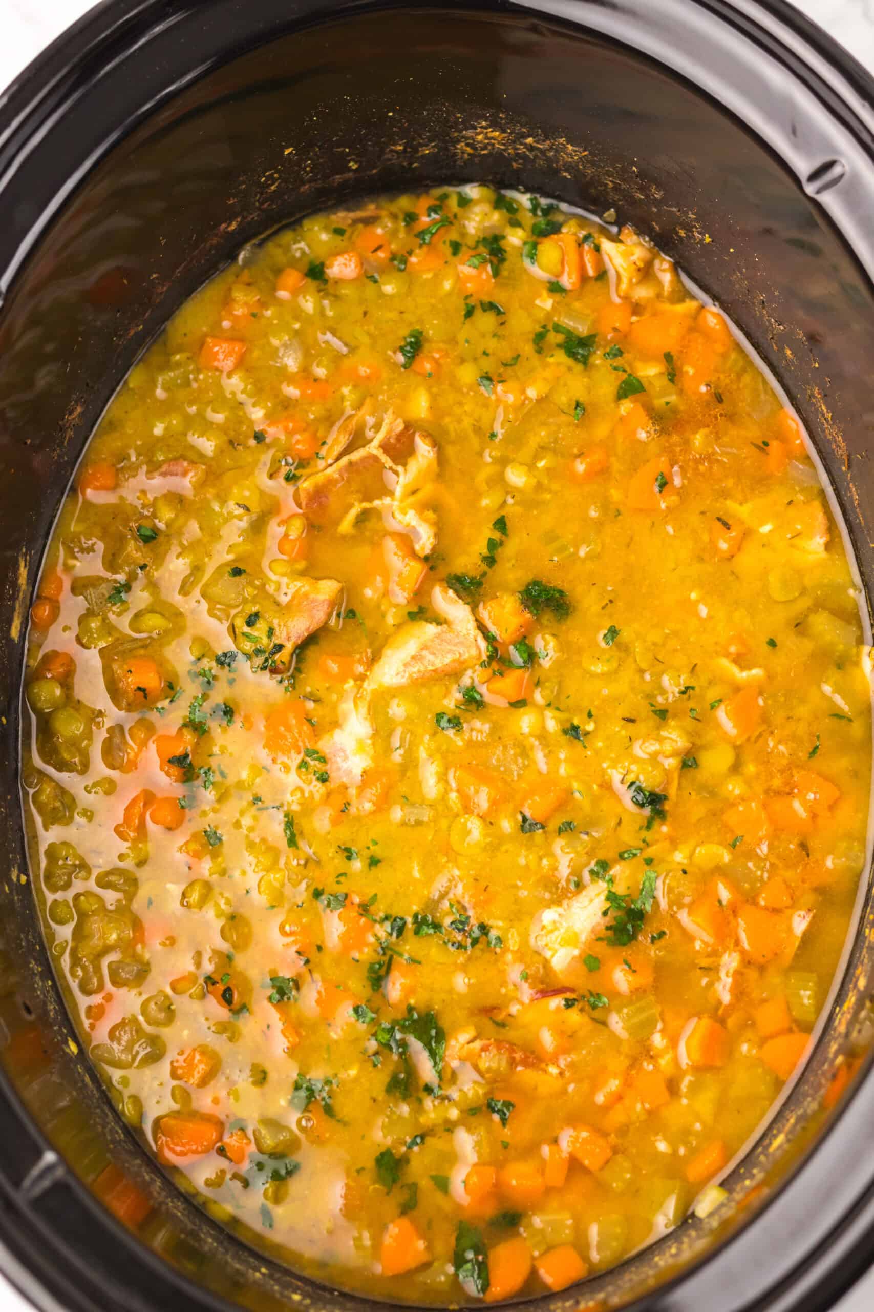 Cover and cook on Low 8 hours or High 4-5 hours, stirring once or twice, until peas are soft and the soup is thick.